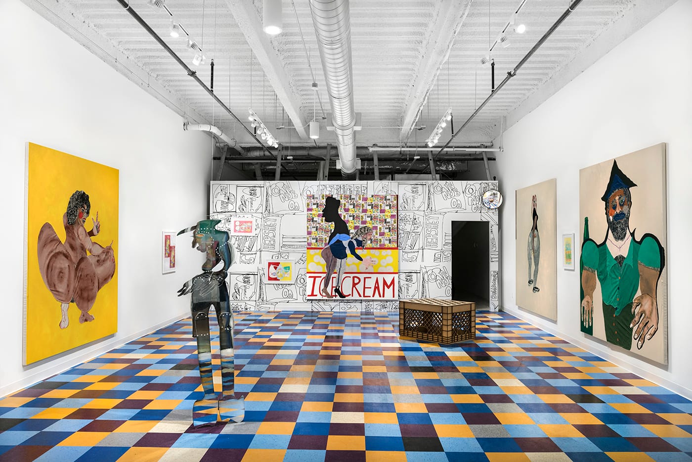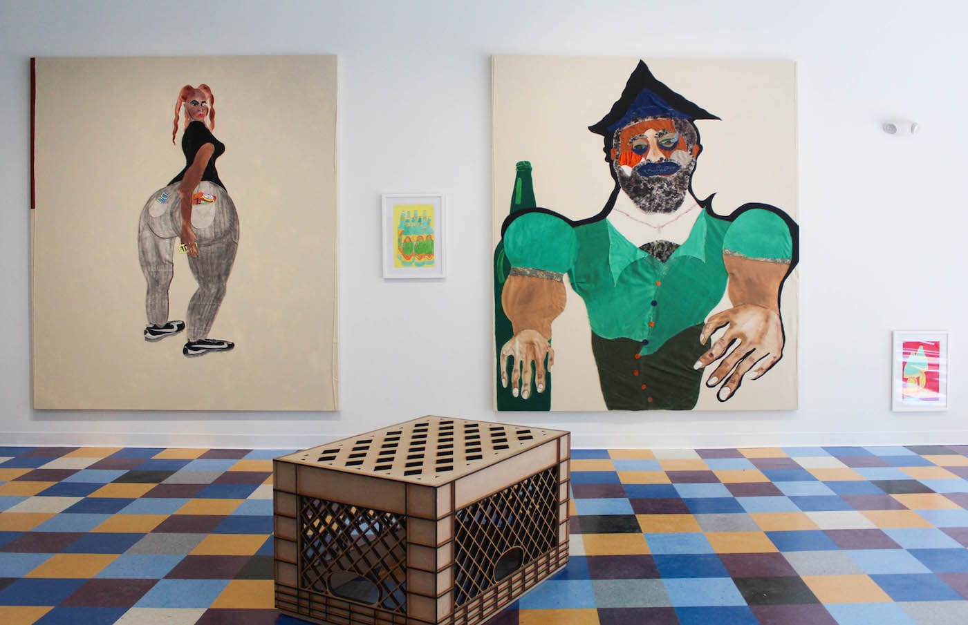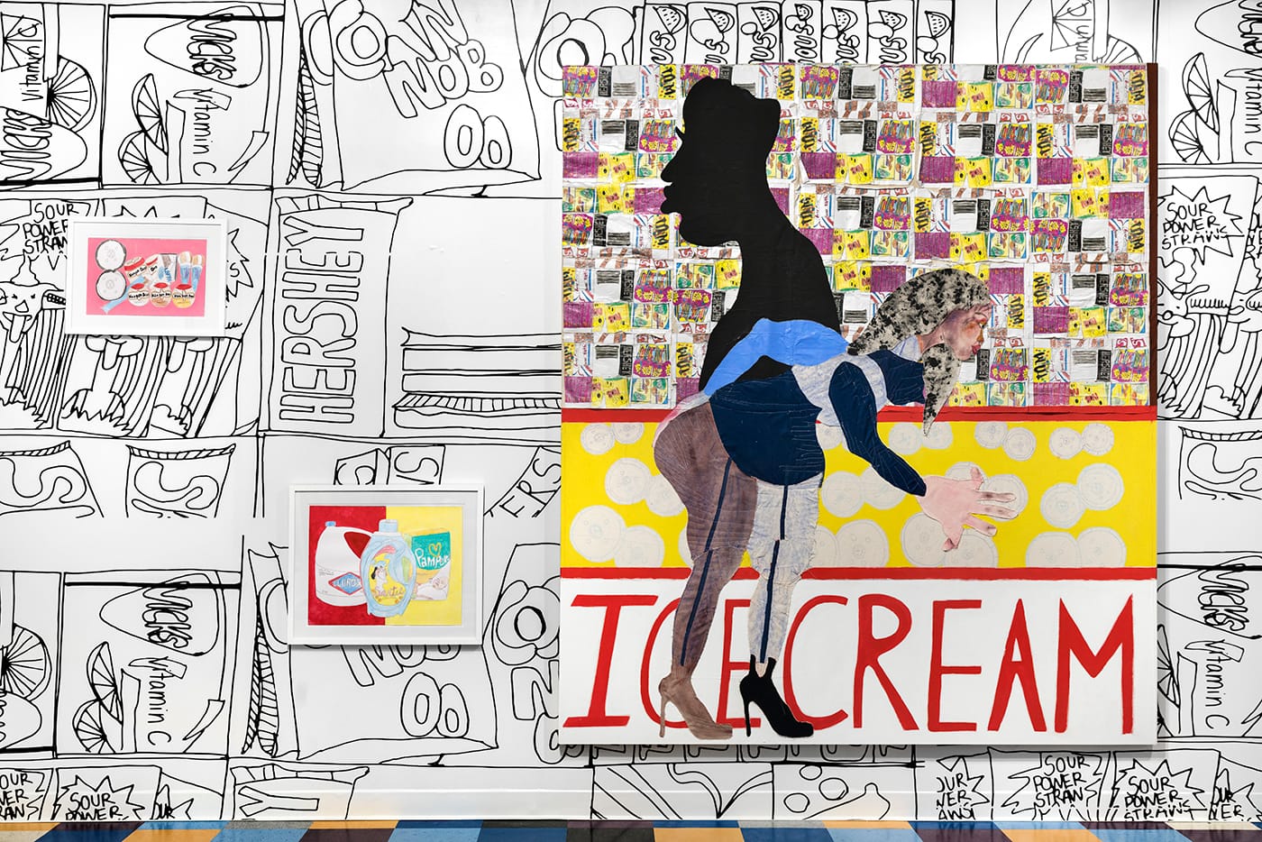I especially liked the huge canvas of a brown, booted woman, browsing through candy. She’s portrayed in a colorful collage, with a silhouetted black figure behind her, presumably heading to another aisle; it reads “ICE CREAM” across the bottom. A milk crate sculpture in the gallery’s center, which also appeared in Bodega Run, is comically big. Against the black-and-white wallpaper, these vivid images and products seem like highlighted moments, quick glimpses into the mundane but singular experience of a run to the store.