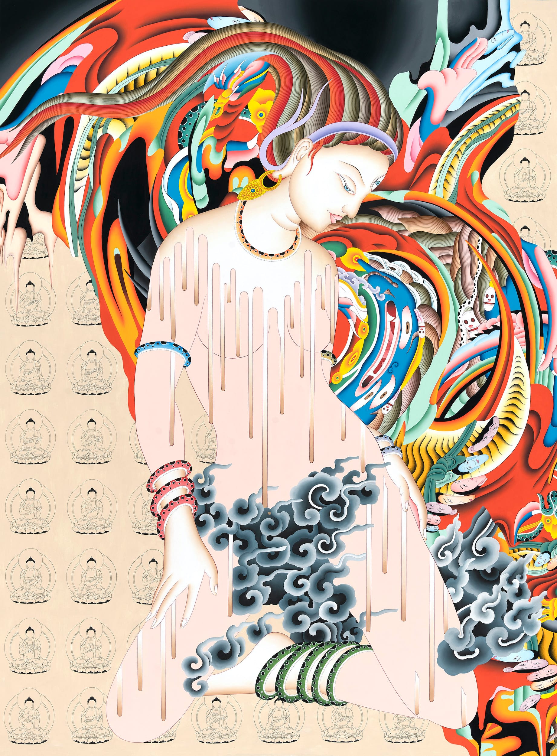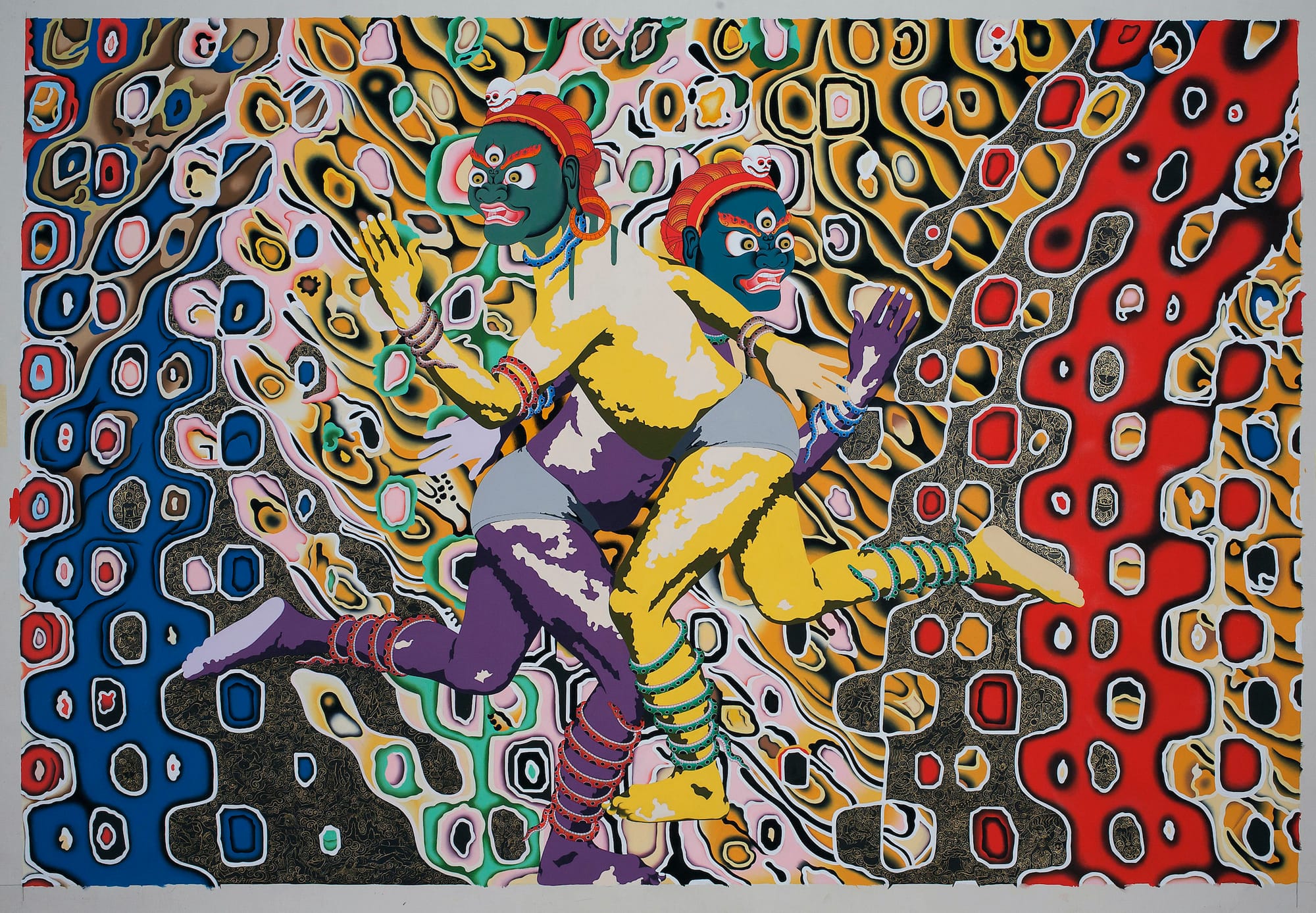 In this narrative context, with the work in conversation with itself, specific motifs recur — the butterflies, for example, or the superhero tighty-whiteys many of the gods wear, occasionally branded with Damien Hirst polka dots. These motifs become inflected with their own private meanings. One recurring element is the use of anamorphic swirls and spirals that Sherpa created for a previous series of paintings (“Protectors”) by taking his stable thangka images and subjecting them to extreme distortion effects on Photoshop, then tracing selections onto his canvases. They begin to invade the “Spirit” paintings, first as background elements, spiral blasts of divine energy. Eventually, the bodies of the gods are inhabited by these “Protectors” — in the final paintings of the series, they become the constitutive flesh of the gods. In “Spirits (Metamorphosis)” (2019–20), for instance, we encounter the same two gods who appeared years earlier in “Two Spirits,” crouched curiously over alphabet blocks. Now their human-toned flesh melts and gives way to the blaring swirl of energies contained within them; the blocks are gone, and the spirits seem to be investigating the butterflies that flew between them previously unnoticed: a transformation of self-assurance.