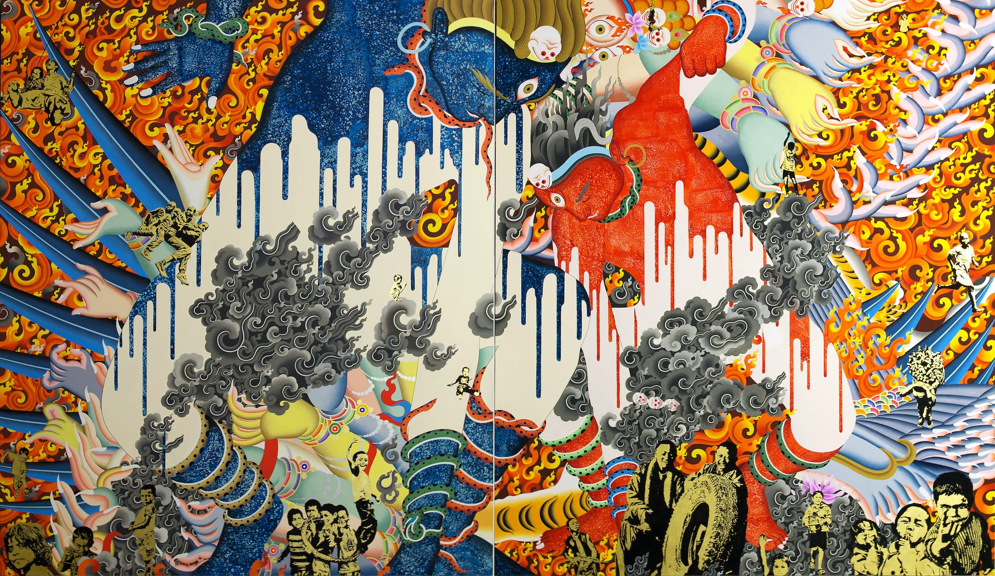 This early work is more obviously pointed in its satire than the later work. In “Shambhala” (2013), an imprisoned god poses for a black and white mugshot, holding a card that lists his prisoner number and hometown (Shambhala, the mythical Himalayan kingdom). The god’s incarceration echoes the brutal 70-year occupation of Tibet itself. But his numinous strength shines through the mugshot: flames still flicker red, the attendant butterflies show up in color through the monochrome gloom.