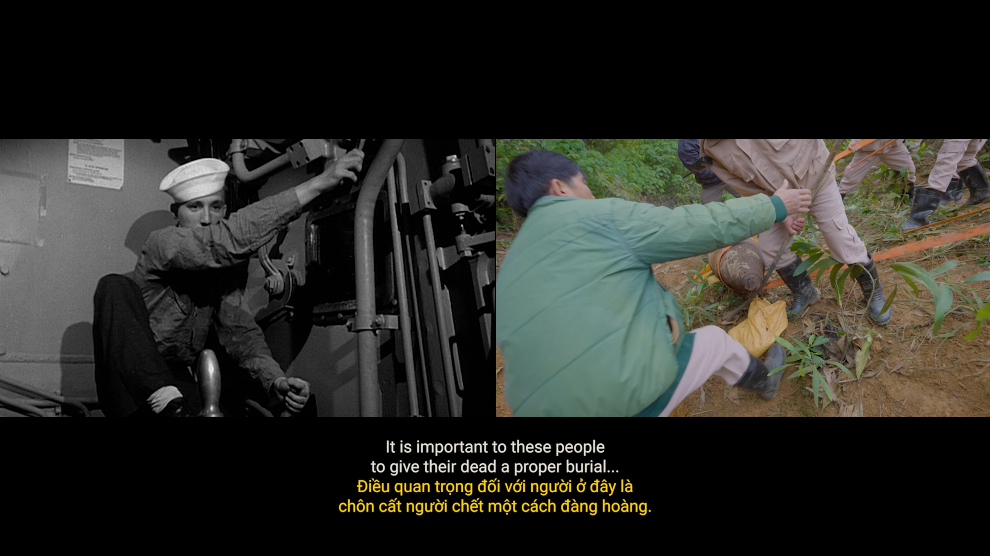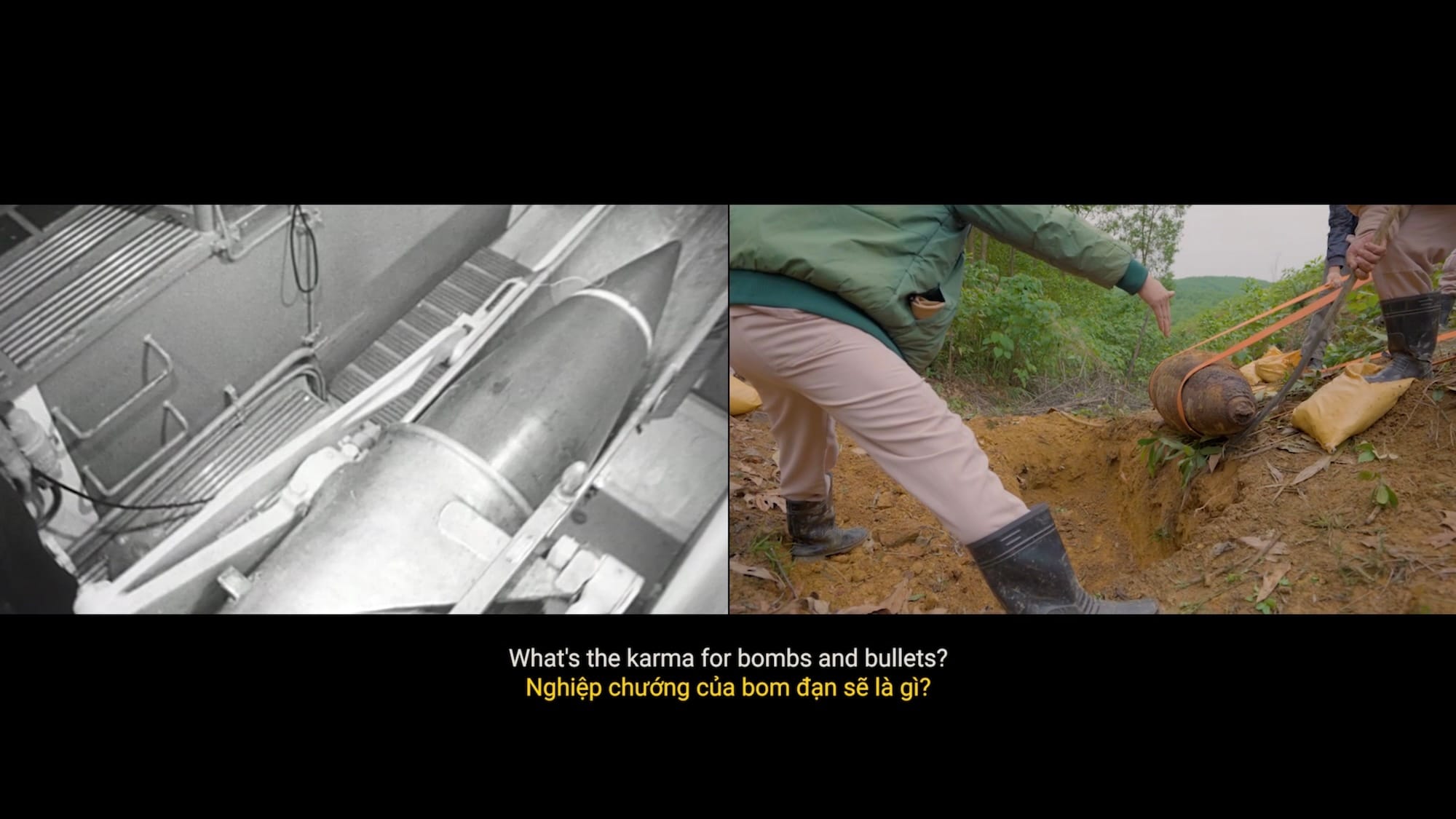 The United States’s bombing of Vietnam during the two decades of the Vietnam War (called the “American War” there, for obvious reasons) constitutes the largest aerial bombardment in history. Tons — literally — of unexploded ordnance (UXO) still stud the landscape. In many of his films, Nguyen interviews Vietnamese war survivors, building a scaffold of human memory. But when people are dehumanized — an essential first front of war, fought right at home, in the theater of the psyche — humanizing an object might, paradoxically, kindle empathy. Accordingly, the “protagonist” of this film is that very unexploded bomb in the right channel, musing in a booming, bass voice.
