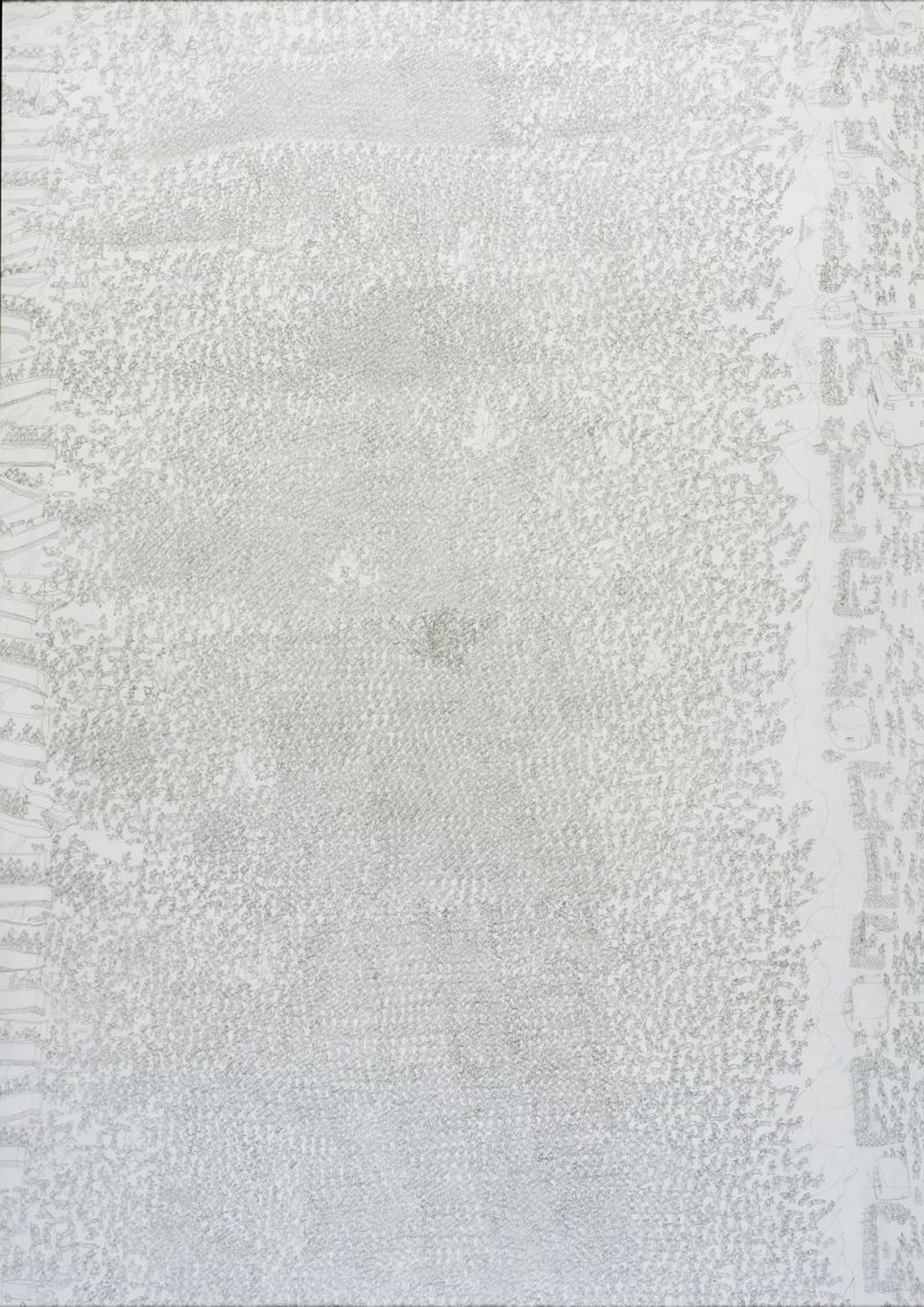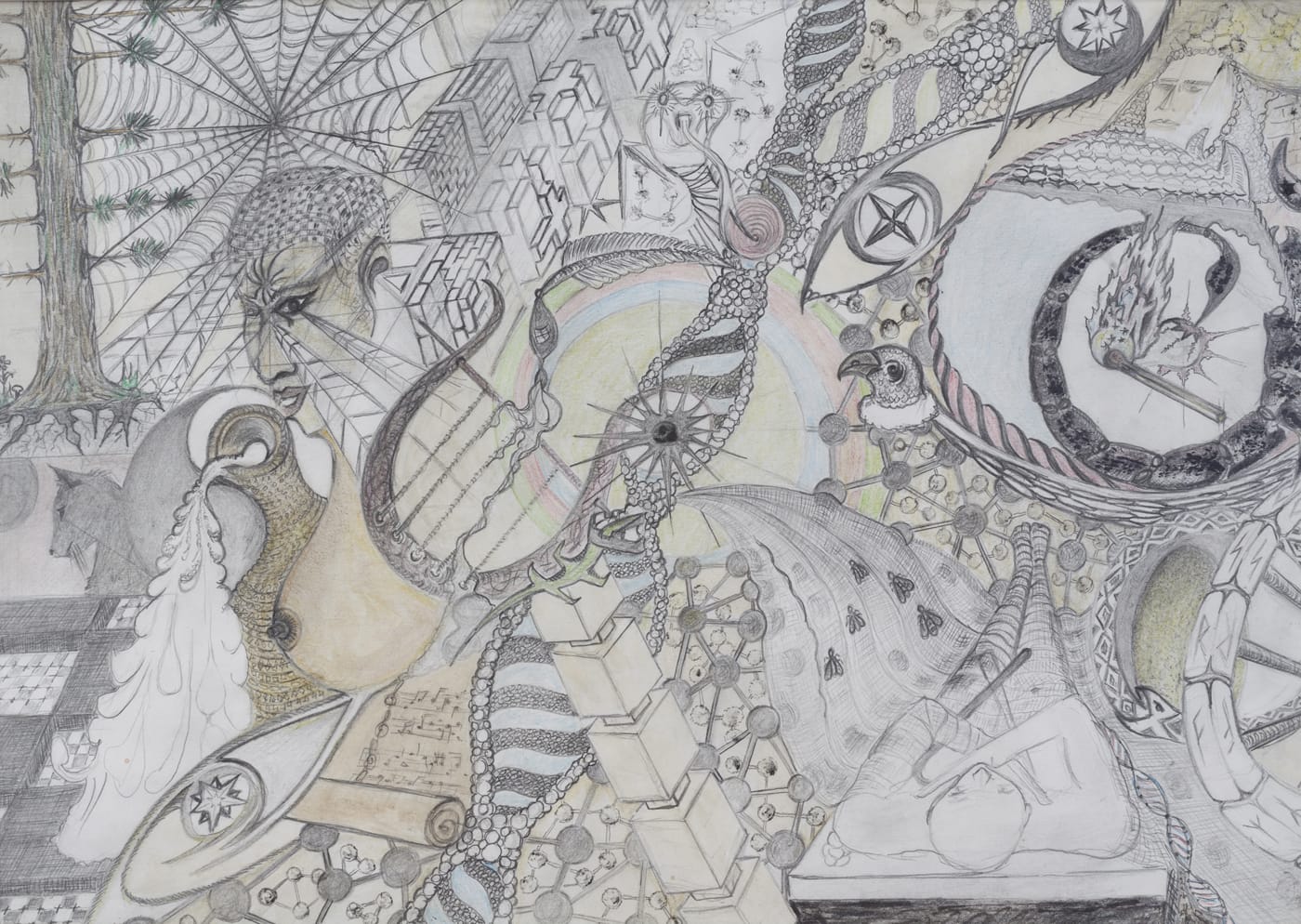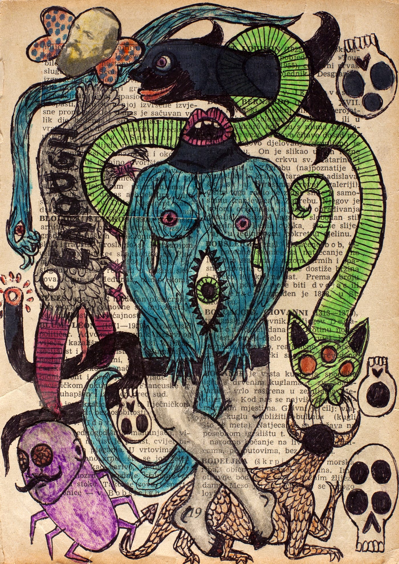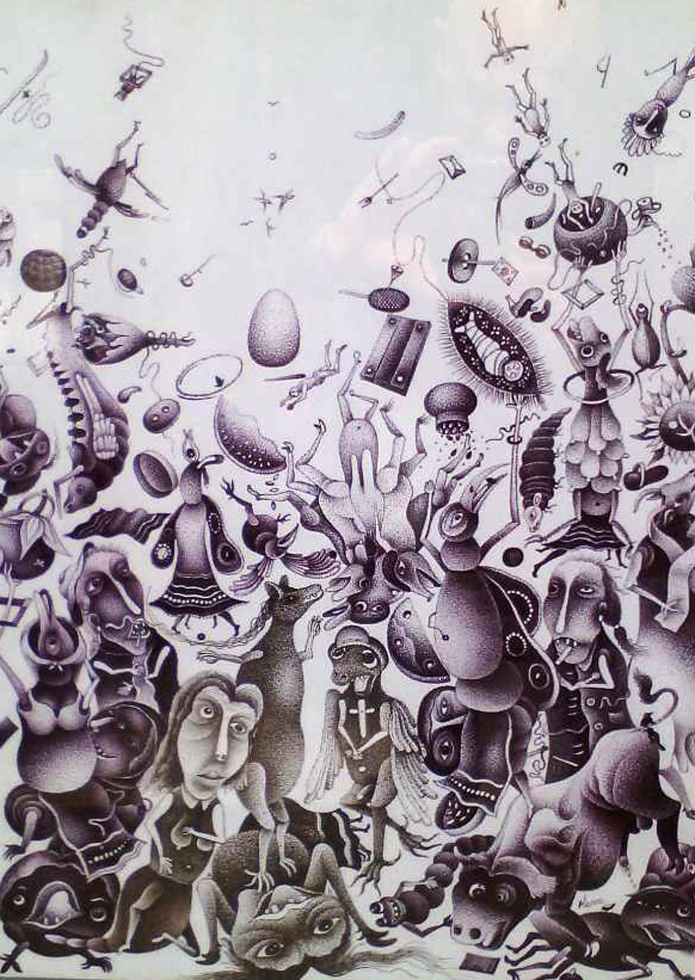 Like Blake, many of the artists of Turbulences dans les Balkans integrate their idiosyncratic visionary imagination (a psychological process) into their fastidious mark making. The overall production quality that Joškin Šiljan, Geringer, Morar, Denic and Simonovic share with Vojislav Jakić is that of maniac accruing. They all are obsessionals that pile on labor-intensive miniature detailing, often distributed with an almost equal-compositional intensity over the entire picture plane. That is how Jakić’s and Denic’s fanciful art collapses foreground and background, thereby inviting the viewer to look into something as opposed to looking at something. In that sense, Jakić’s and Denic’s work requires slow active visionary participation on the part of the willing viewer. Something improbable but increasingly necessary as counter-point to our impetuous click-bait culture. Jakić’s and Geringer’s and Denic’s eerily lingering visionary art may even be said to include the political function of strengthening society’s powers of imagination by countering clean, fast, obvious, pop simplification with veils of visual commotion.