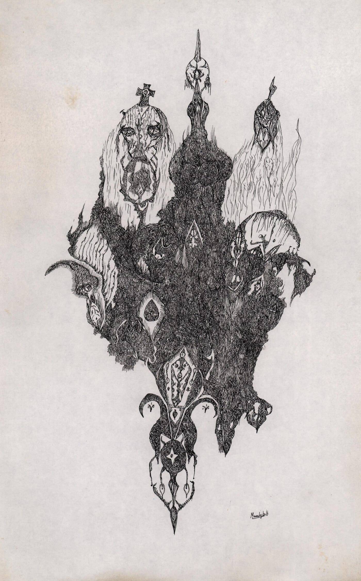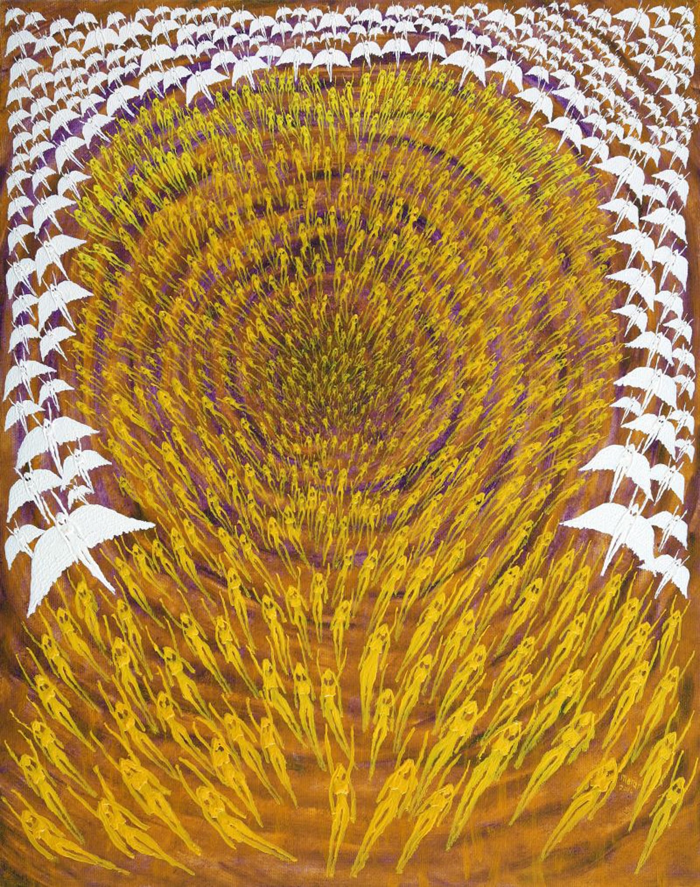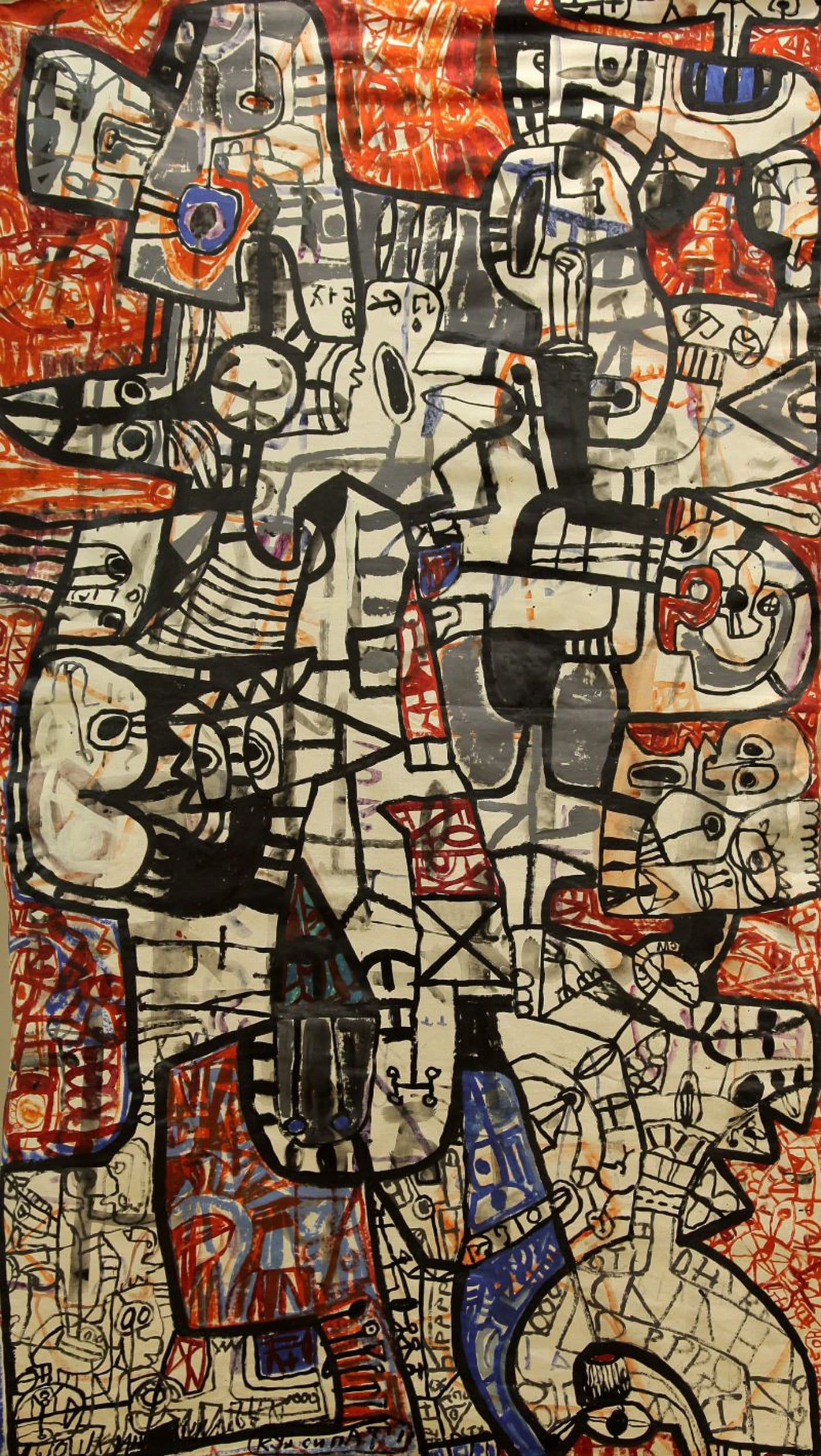 I can also see this noisy inclination exhibited as a networked frenzy of quasi-abstract lines punctuated with roaming eyes in Šiljan’s nonchalant painting “Who are you? #2349” (2010). Indeed, this painting’s tribal look is instructive: recalling that the preliterate prehistoric precedent of these art brut artists is to be found in ancestral divinatory activities of the seer/soothsayer often found among nomadic tribal cultures all across the globe. This seers’ intuitive vision was regarded as a way towards spiritual comprehension useful for guiding decisions of the tribe’s movements in relationship to weather and migrations of animals from which the tribe depended on for their continued existence. These super-star seers often would do something like ‘read’ the abstract ashes of the campfire; seeing in them meaningful patterns and signs. Such shamanism remains a part of the religious life of some Northwest American Indians and still is among Tibetan Buddhists (the indigenous expression of Bon shamanism and Tibetan Buddhist practices are historically interwoven, and current Tibetan Buddhism is a synthesis of the two traditions). Rituals of divination are found throughout sub-Saharan African cultures, from west, central, and east Africa and the Sudan to South Africa and Madagascar where people have developed ways to ‘read’ visual noise to help them deal with affliction, social conflict, and the seemingly arbitrary destructive forces of nature.