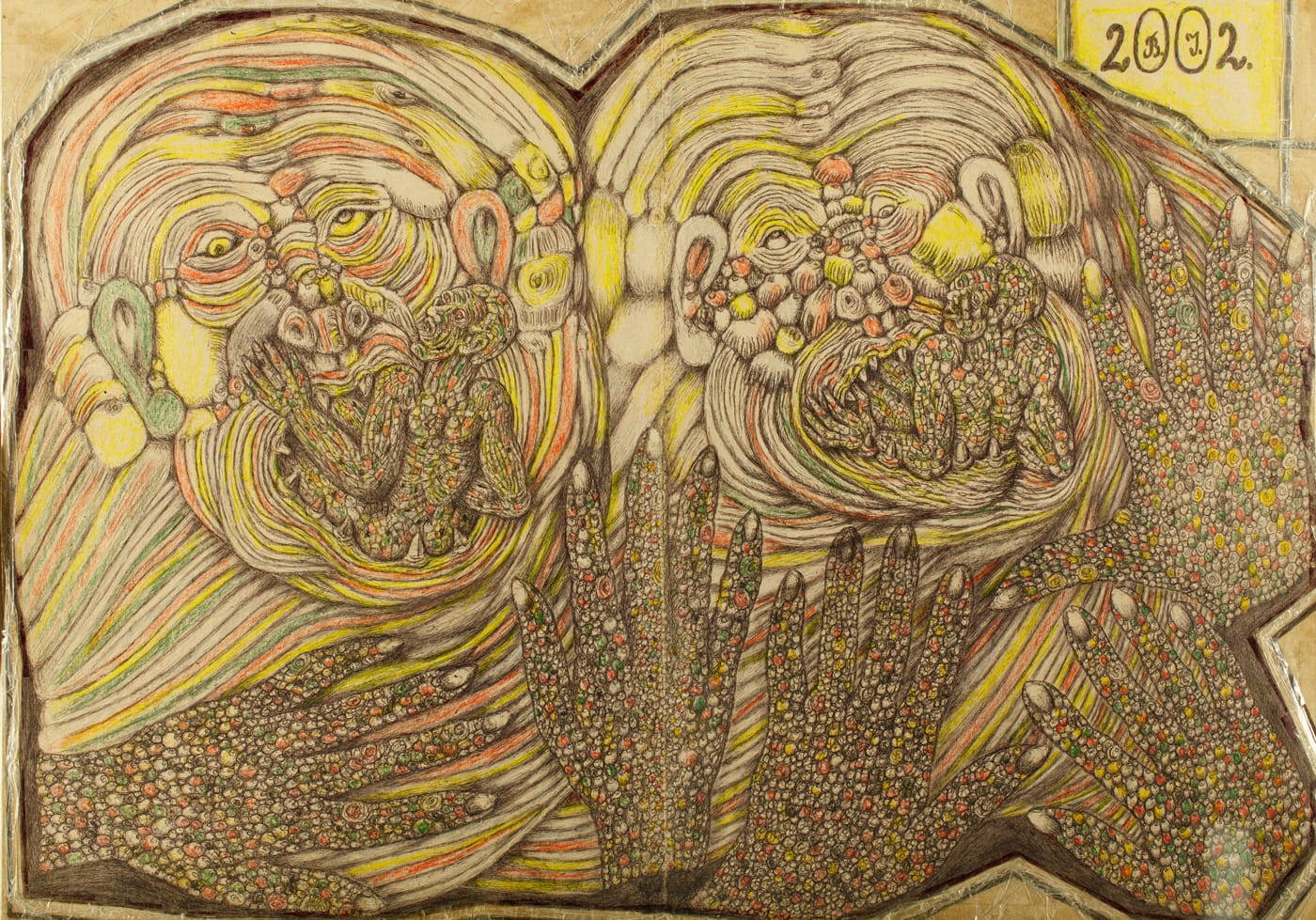 The noise of turbulence is the metaphor that has been chosen for these outsider images that productively break down the difference between foreground and background. For example, Joca Geringer’s uncanny drawing “Untitled” (2013) is a stoner’s delight: a free-flowing wonderment of recombinant spaces and faces hiding and emerging out of a hectic cosmic mind-meld. It is ripe with delirium and will look familiar to anyone who has experimented with drawing and weed while in high school. Jovanović Ljubiša Kene’s and Dragan Milivojević’s “Untitled” drawings are also outstanding in a sly surrealist vein. They remind us that much Balkan Art Brut is not that brut – as it doesn’t stray far from that of the Belgrade Surrealist Circle (arguably one of the most vibrant early-surrealist strongholds in Europe as detailed in “When the Margin Cries: Surrealism in Yugoslavia” by Sanja Bahun-Radunovic). Active from 1922–1932, the surrealist movement in Yugoslavia yielded a generation of poets and numerous individual and collective makers of cadaver exquis (exquisite corpses), automatic texts, collages, decalcomanias, assemblages, photographs, and bizarre theoretical propositions published in the almanac Nemoguće-L’impossible (The Impossible) and the magazine Nadrealizam danas i ovde (Surrealism Here & Now). These publications, like art brut, examined the possibilities of acting spontaneously and irrationally when making art. So, even as some of the work here, such as Kene’s tempestuous drawing and Bojan Đorđević’s (a.k.a. Omča) drawn “Bestiary” (2014), are contextualized as nonacademic and un-art-educated, they conceptually are not that much different from the collage-based non-natural images of the Belgrade Surrealists Circle.