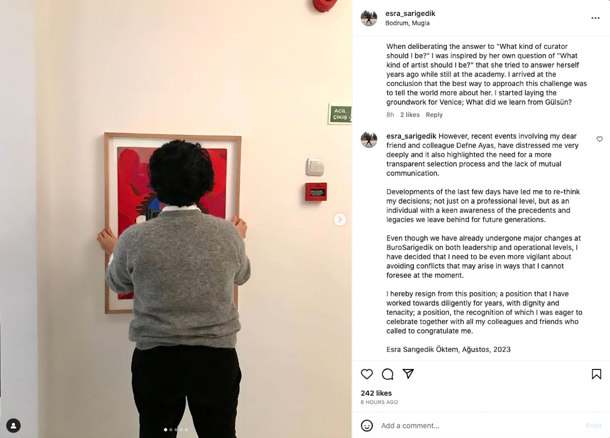 Esra Sarıgedik Öktem stepped down after the Istanbul Biennial appointed a member of its own board as curator in place of Defne Ayas, the agreed-upon candidate.