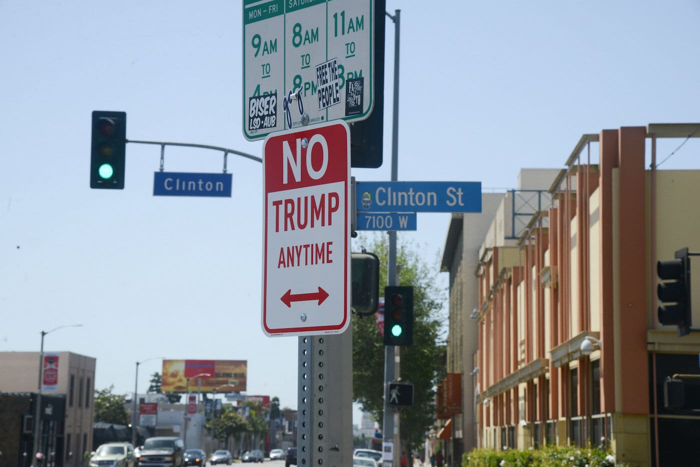 Last weekend, various streets across the United States became designated Donald Trump-free zones. Metal signs reading “NO TRUMP ANYTIME” popped up at heavily trafficked locations in Los Angeles, New York City, Chicago, and Washington, DC, as part of a nationwide campaign by LA-based street artist Plastic Jesus — the most recent of the many anti-Trump art projects to emerge this year. Although many have since vanished, the designs are now available online and are free for the taking for anyone wishing to create a Trump-free zone in his or her neighborhood.