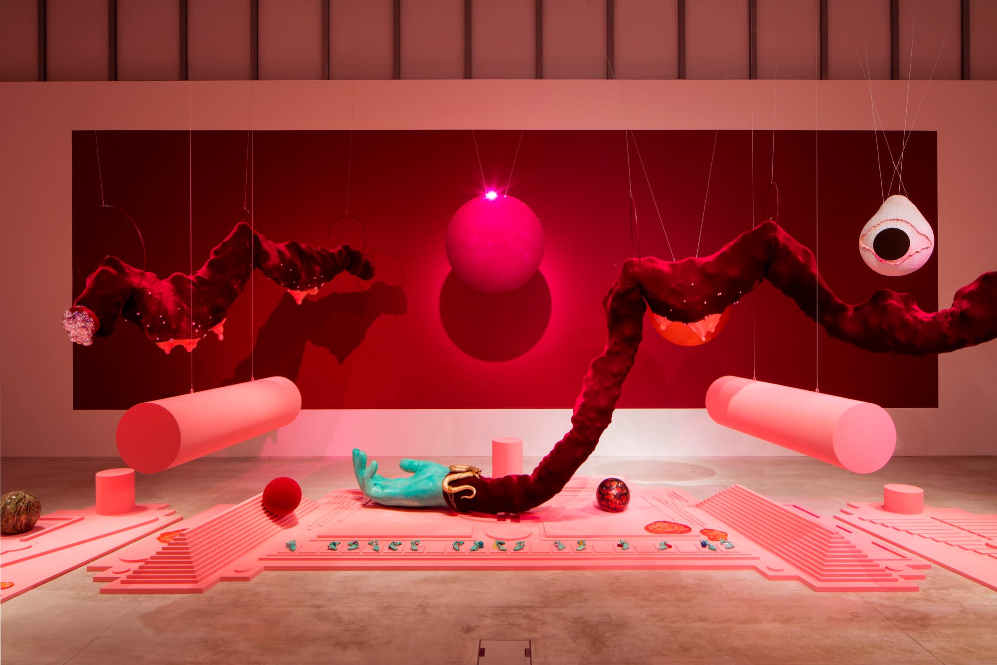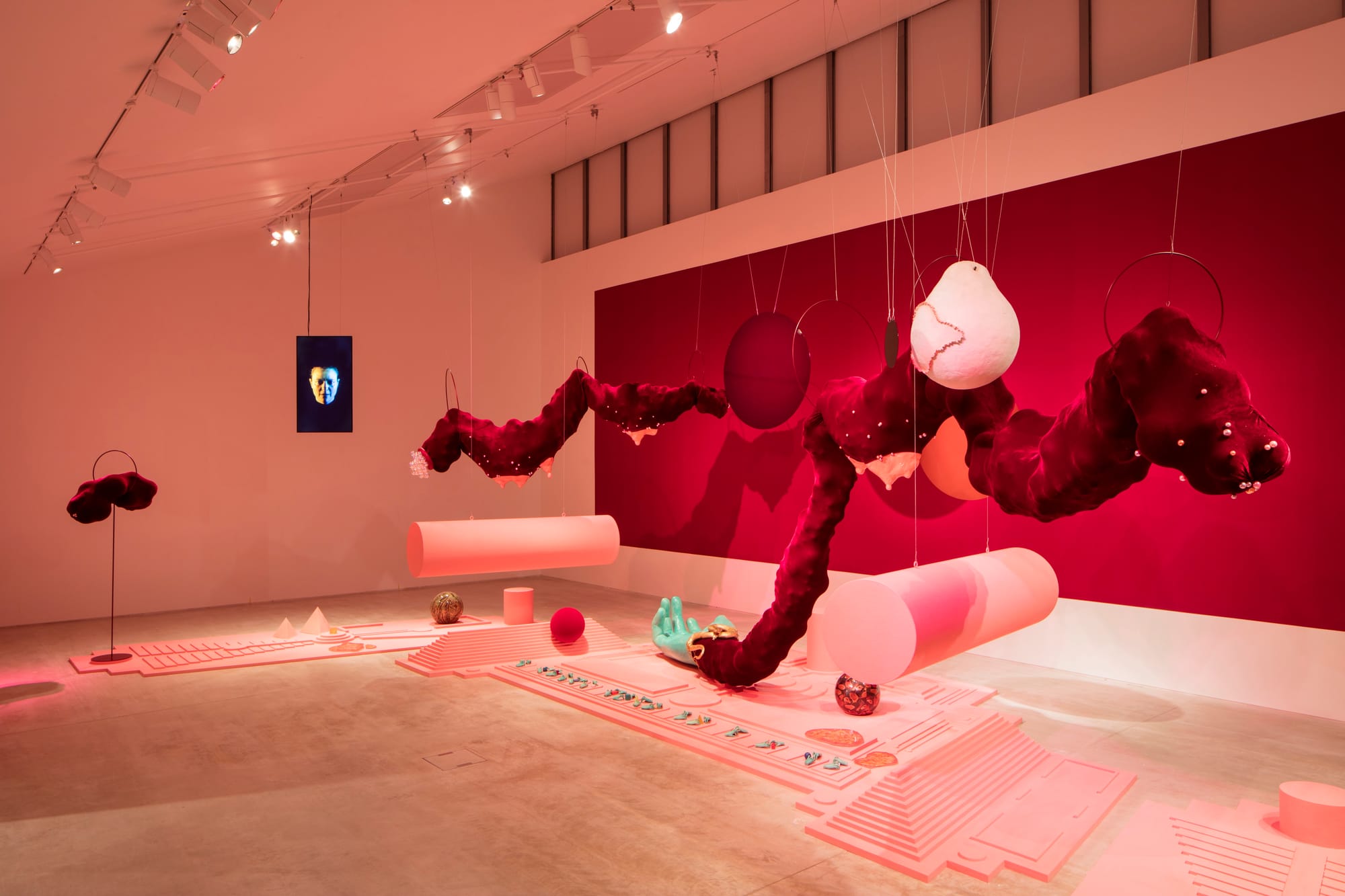 There is a similar sense of play in Tai Shani’s zany pink installation piece, which is the latest installment in her project DC: Semiramis, now in its fourth year. London-born Shani, 43, works in installation, performance, and film. Her Turner Prize presentation, which incorporates elements of all three, is composed of a tableau of surreal shapes and forms: a floating red velvet caterpillar with udders, sickly-green disembodied hands, and orange marbled puddles. From a hanging screen, a woman narrates a story in 12 chapters, each centering a different mythical character: Cube of Flesh, The Vampyre, The Neanderthal, Phantasmagoregasm. Six of these chapters will be brought to life in a series of performances between November 15-17. The project draws inspiration from a utopian proto-feminist text by the French medieval writer Christine de Pizan, as well as contemporary gender theory. It is meant, according to the artist, to reflect “feminine subjectivity and experience.”
