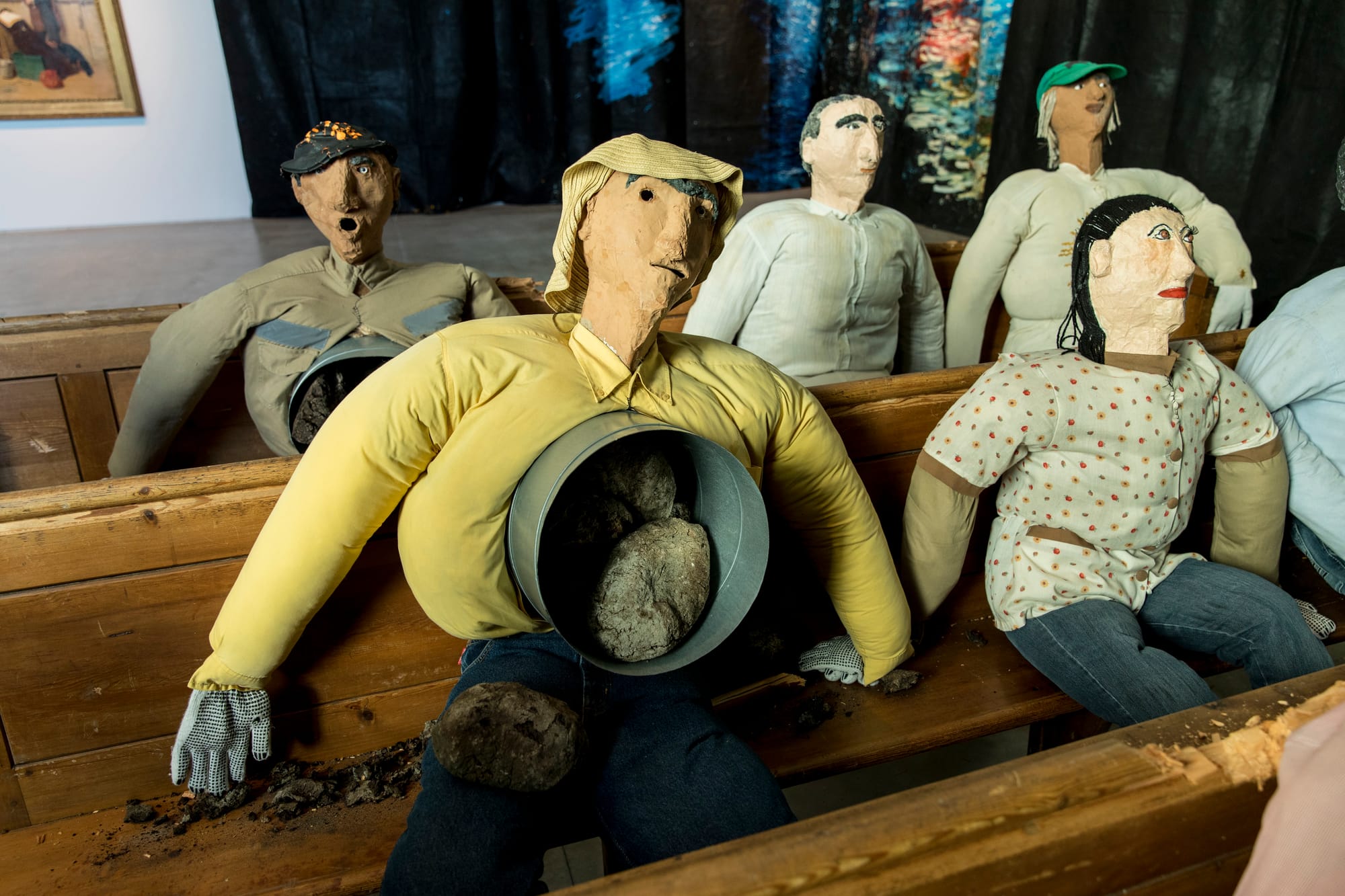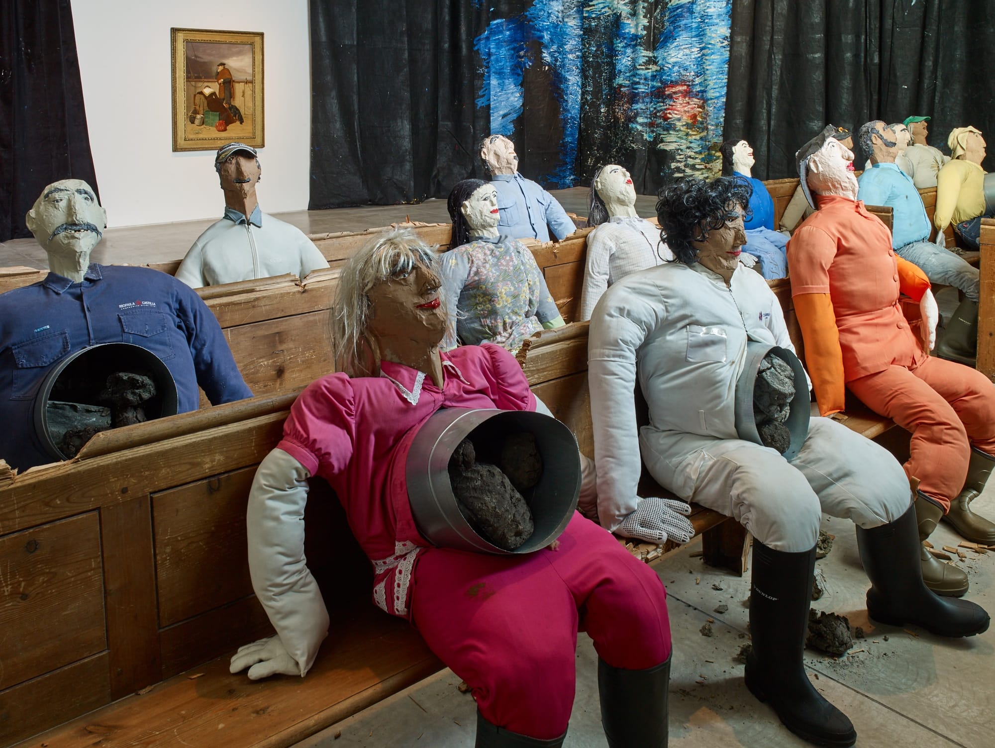 The 33-year-old Oscar Murillo focuses his presentation on the theme of migration. His installation collective conscience (2015—ongoing) is made up of 20 colorfully-dressed papier-mâché effigies, inspired by a Colombian New Year tradition. The life-size figures which, according to the artist, represent “human capital” or a “mobile globalised workforce,” traveled to the museum from London by commuter train. Now in Margate, they sit on scuffed wooden pews looking out of the museum windows at the North Sea. Except that their view is obscured by a number of black canvases — another work by Murillo and part of his series, The Institute of Reconciliation (2014 — ongoing), which explores the cultural symbolism of blackness.
