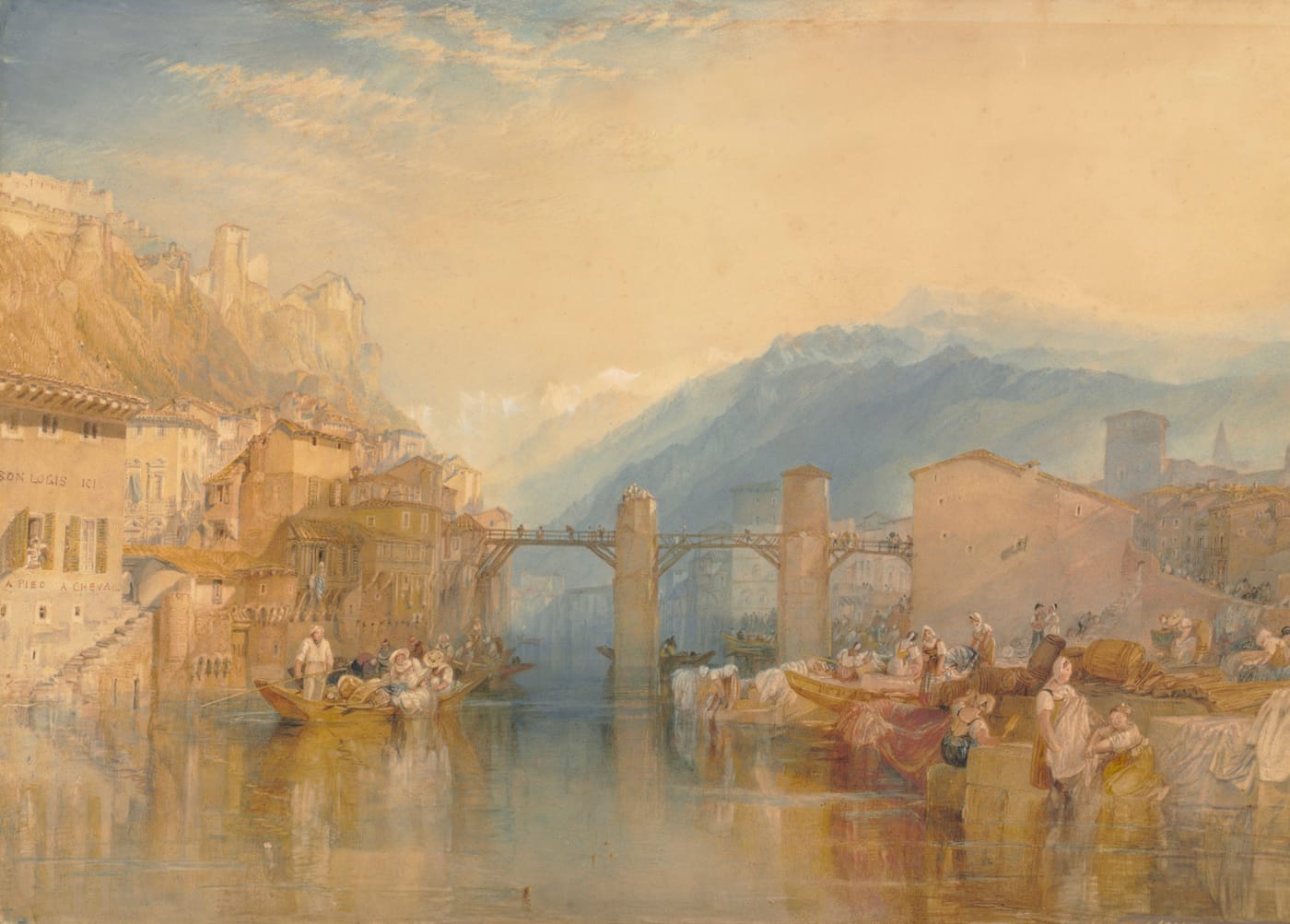 These watercolor scenes (professionally engraved to reach a wide audience) might appear to be simply skillful, picturesque representations of notable places across Britain, ornamented with the quotidian details of nineteenth-century life. Invariably, however, they are richly allusive, steeped in historical references or observations on contentious current issues, and thereby demonstrate Turner’s desire to create scenes that act as portals through which the viewer can contemplate much that is not actually depicted.