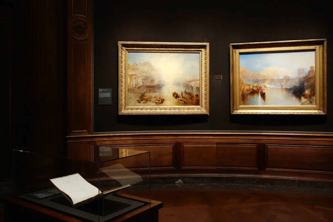 The incomplete work was among the bequested items from Turner’s studio that are now at the Tate. Its display with the other two finished paintings, acquired over a century ago by Henry Clay Frick, marks the first time the three have met. The grouping offers a rare view of a stage of his 1820s work, revealing how Turner built up the broiling color on a white-primed canvas, which was radical for a period when most contemporaries were using earthen tones. Appropriately, one of the three “ancient” ports representing classical scenes on the opposite wall responds to the story of Regulus, the Roman general whose eyelids were cut off by the Carthaginians so that he went blind by staring at the sun. You might feel slightly sunstroked if you try to find him on the canvas, where he’s suggested by a few fiery brush strokes amid the brightness.