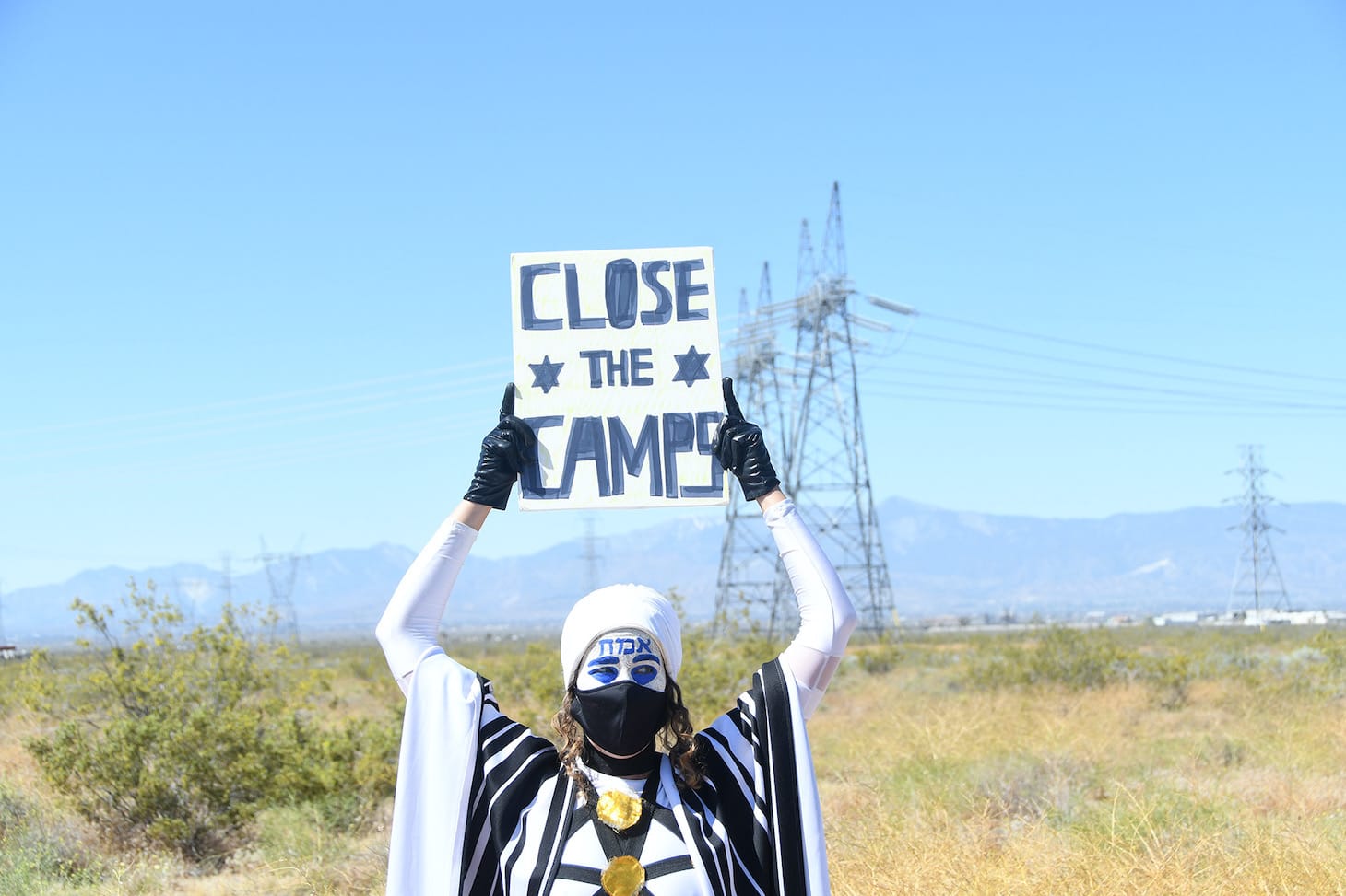 Golems are significant to Jewish mythology and generally mean something akin to an unfinished human or a raw form, though interpretation of both the mythological creature itself and its meaning are highly mutable. They tend to be depicted as dumb and inherently obedient, though sometimes they are portrayed as rebelling from their master-like creators. Following this vein, Weitz’s golem regularly takes stances on social justice issues, such as in MY GOLEM PROTESTS (2019–2020). The performances, and the photos documenting them, depict Weitz as the golem character protesting against ICE detention centers. The Golem character, dressed in a lavish costume consisting of a white leotard, tights and full-face makeup, holds up signs that say “NEVER AGAIN MEANS FREE THEM ALL” and “CLOSE THE CAMPS,” drawing parallels between the United States’s current treatment of immigrants and the Holocaust.
