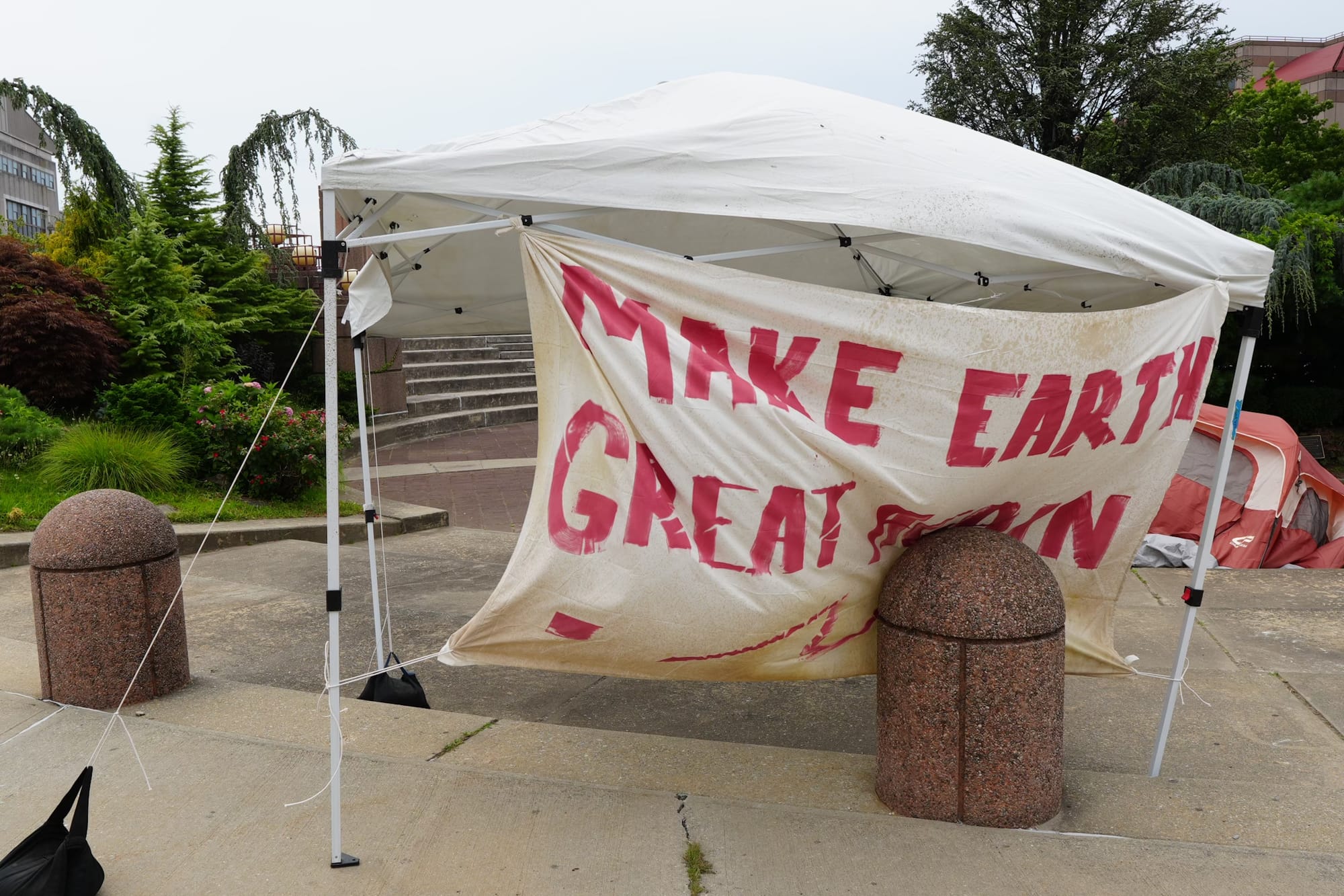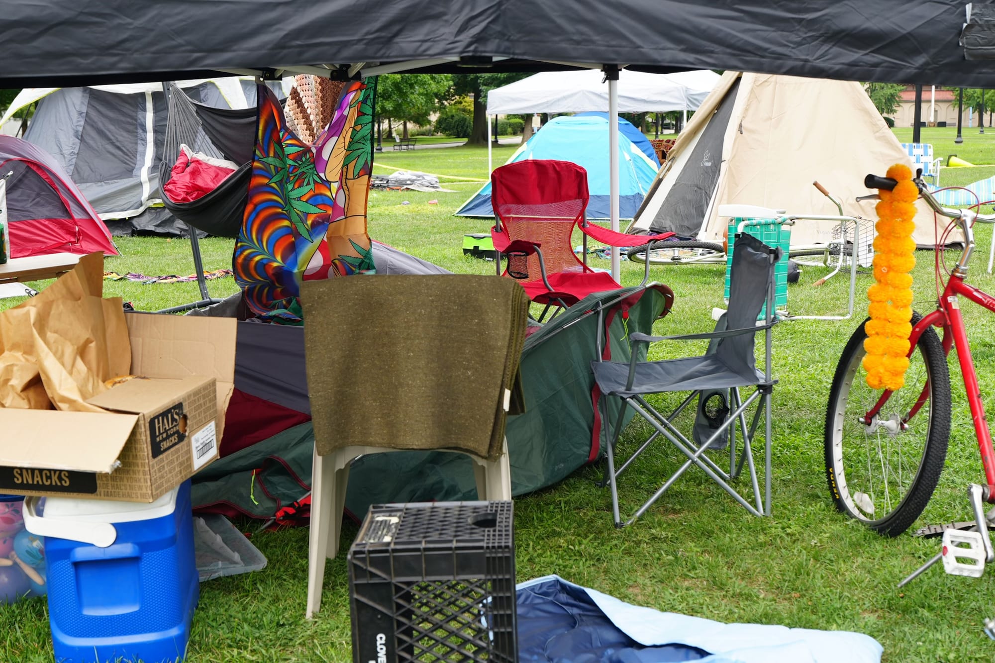 The imitation campsite, consisting of multicolored tents and signs featuring ambiguous environmental protest language and deliberately misspelled words, is part of an ongoing shoot for CBS’s FBI: Most Wanted, a television series by Wolf Entertainment.