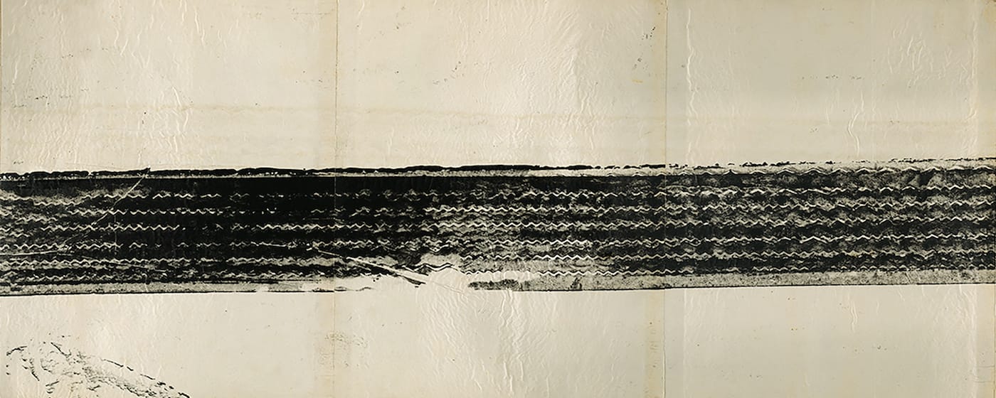 He made a drawing using a car (a Model A Ford, to be exact) as the drawing instrument. A friend drove the car slowly, inching it forward, on joined sheets of typing paper that had been carefully placed in its path. Two tire tracks are visible, one in ink and the other the impression left by the tire treads. The tire tracks, perfectly aligned from sheet to sheet, form a scroll nearly 24 feet long, a drawing of two wide lines, one of which is ghostly, that stretches from one wall to another. He could have made a dozen or more of these scrolls, but he was too restless to do it again.