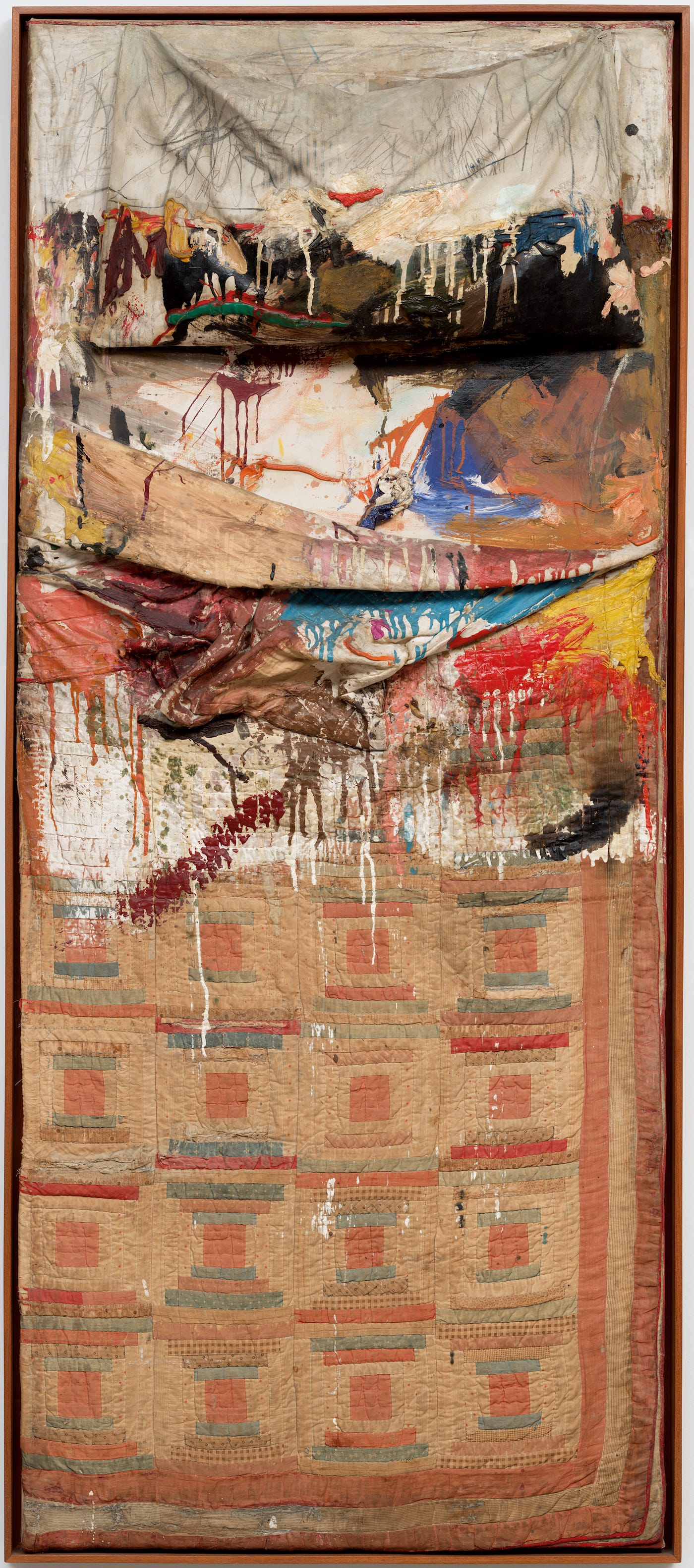 He smears paint, nail polish, and toothpaste onto a pillow and quilt, evidence of what happened there. The quilt is a grid, which is the way he organized his diverse images and materials. He puts one rectangle (or thing) next to another. He never got out of this way of arranging his images.
