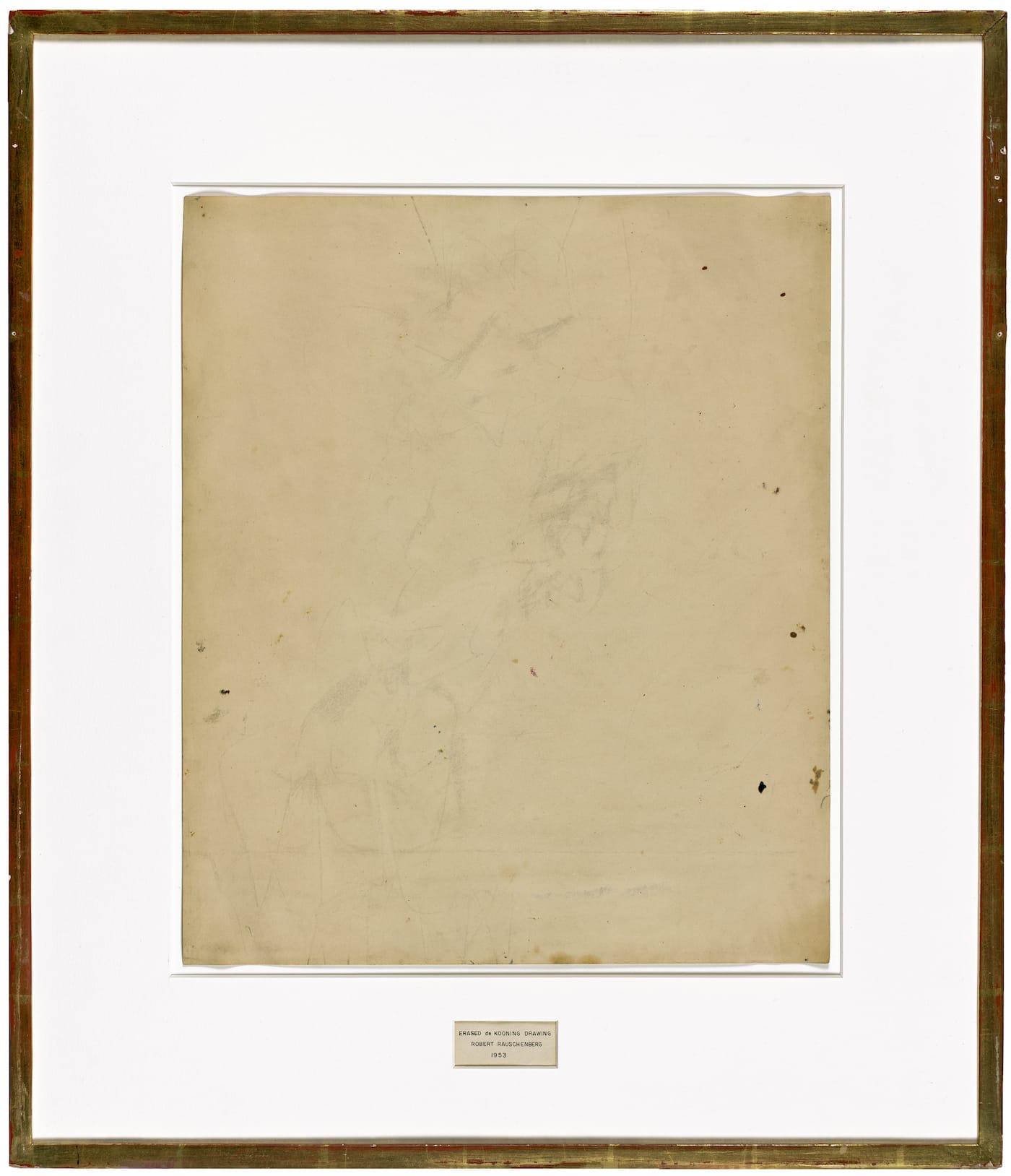 He kept the erased drawing in a drawer and did not show it. Another artist convinced him to put it in an exhibition. This artist matted the erased drawing and fit it into a gold gilded wood frame. He also provided the label, which he inscribed with perfect penmanship, using a metal template in blue ink, and affixed it into a cut-out in the mat. The gilded frame and label authenticate the drawing as a museum piece. One artist made the drawing. Another artist erased it. A third artist contextualized it. The context helps complete the viewer’s understanding of what is being looked at.