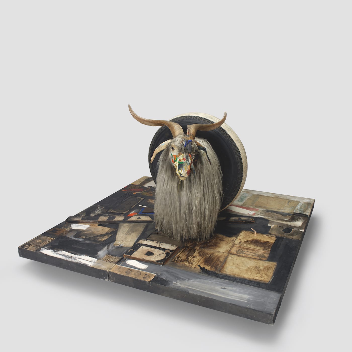 He has gotten the tire around the stuffed angora goat, which he first saw in the window of a secondhand office furniture store. Eventually, through the suggestion of another artist, the same one who provided the gilded frame and inscribed label for his erased drawing, he places the goat on top of a painting lying on the floor instead in front of a painting hanging on the wall. The painting, which becomes a platform, is raised on casters. The platform becomes a low pedestal. We can still look the animal in the eye and contemplate his paint-smeared head.