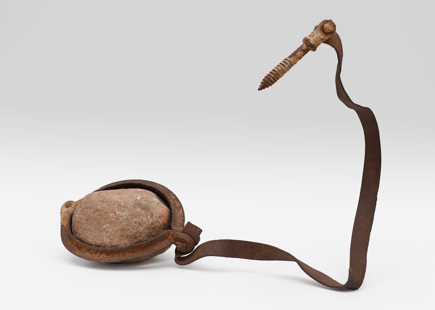 He used a rope and nail to tether a stone to a wood block. He made another work the same year, in which he attached a metal screw eye inside a box. He then tied twine to the screw eye and wrapped it around a stone that, in this instance, he placed outside the box. The person standing next to me says: “ball and chain.”