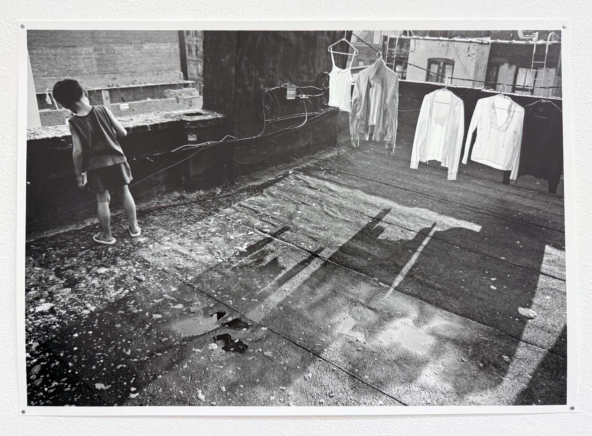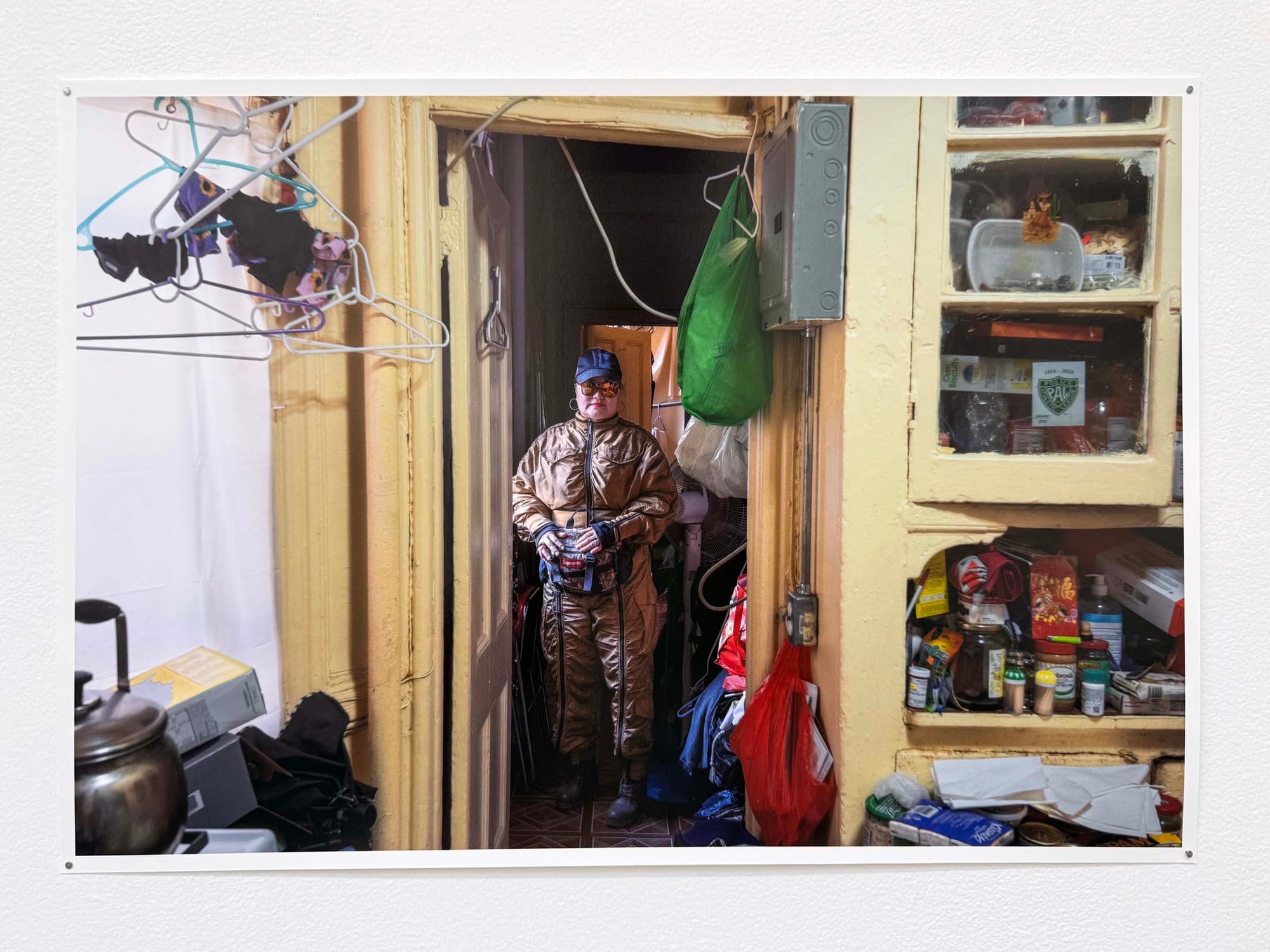 Picture this: You are a set of clothes hangers strung out on a rooftop clothesline, placed there by a family trying to extend their supply of square footage and fresh air in their small apartment ("Drying Laundry,” 2004). You are part of the family order created and maintained by the mother and captured by the photographer: In “Bathtime” (2004), for instance, you hang expectantly above the bath, and you are indispensable to “Family Portrait” (2004), framing the top edge of the composition with a line of coats. You watch the shadows grow long (“Peeking at the Neighbors,” 2003), watch a little boy bike around, watch him grow up. The little girl becomes a moody teenager, holding a flip phone in her hands (“Bored,” 2011), and then a smartphone (“Watching Black Mirror,” 2019). The stylish mother is now embracing her fashion sense — in “Outfit of the Day” (2024), she’s in full streetwear, including a tan jumpsuit and a Supreme bag.