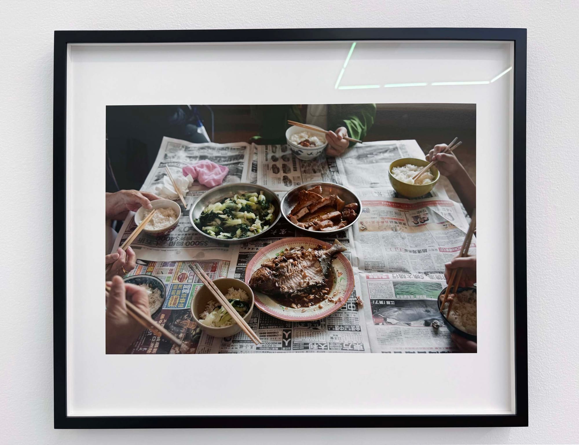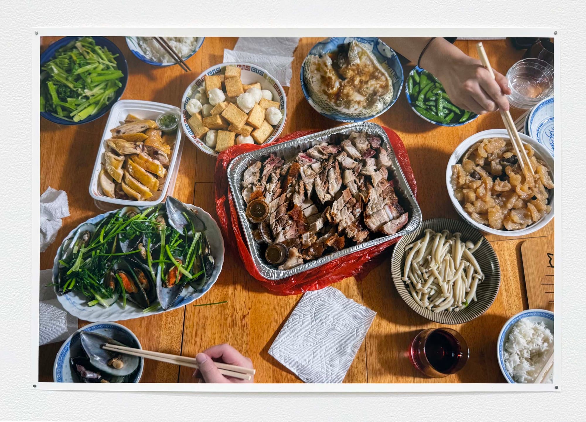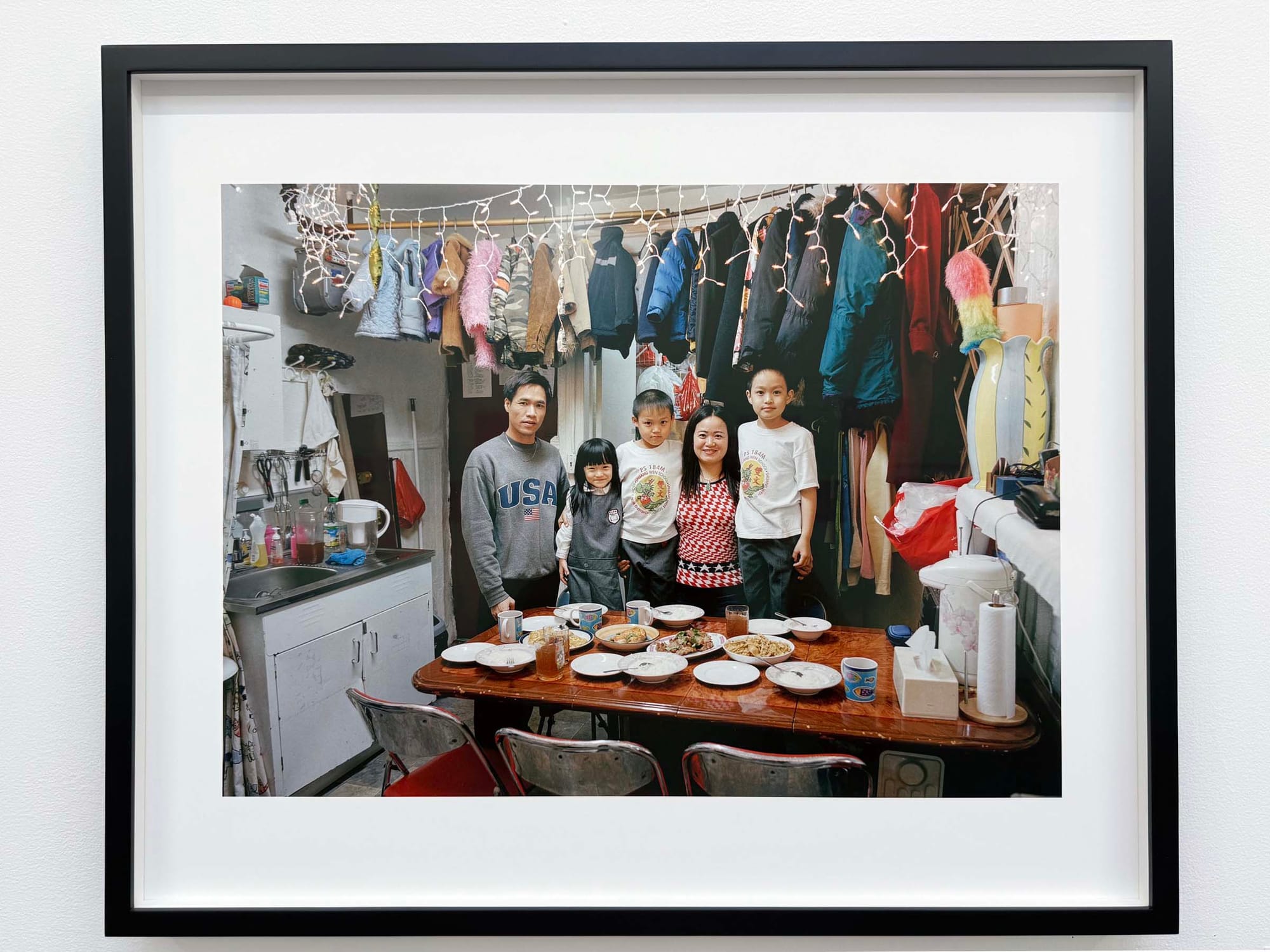 Indeed, seen in this way — dozens of large and small photographs hung in loosely chronological order, with some in frames and others pinned directly to the wall — what comes through most clearly might be the depth of Holton’s commitment to the Lams, which transcends Ludlow Street. New works display elements of the their own self-fashioning, as the children have grown into themselves. My favorite piece in the show might be “Taylor Swift Karaoke” (2024), in which that once little girl is luminous, even ecstatic, singing with her eyes shut and her palm splayed open in what is decidedly not a Chinatown apartment. Even the style of the photographs shows signs of change: The blue and pink light (“bisexual lighting,” in internet parlance) of “A Crowded Christmas” (2024), which depicts her staring straight out at the camera, looks like it could be a still from Euphoria. “Lunar New Year Dinner” (2024) looks distinctly more Instagram-y to my eye — overhead perspective, saturated colors — than 2011’s subdued “Dinner for Seven," taken from the perspective of a dinner guest.