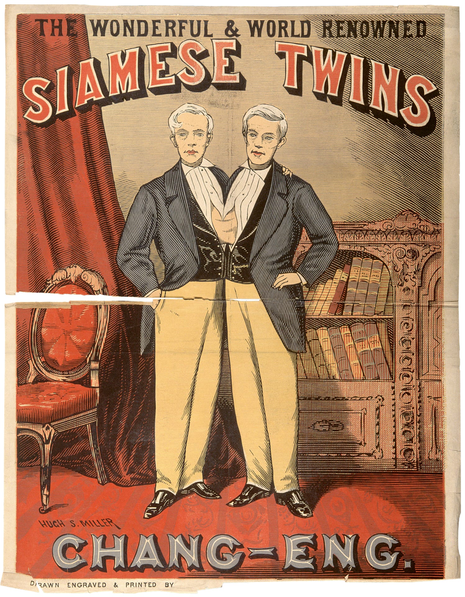 Chang & Eng in evening dress, color wood engraving by H.S. Miller. These conjoined-twins are the original Siamese twins, from whom the name derives (courtesy Wellcome Collection, London)