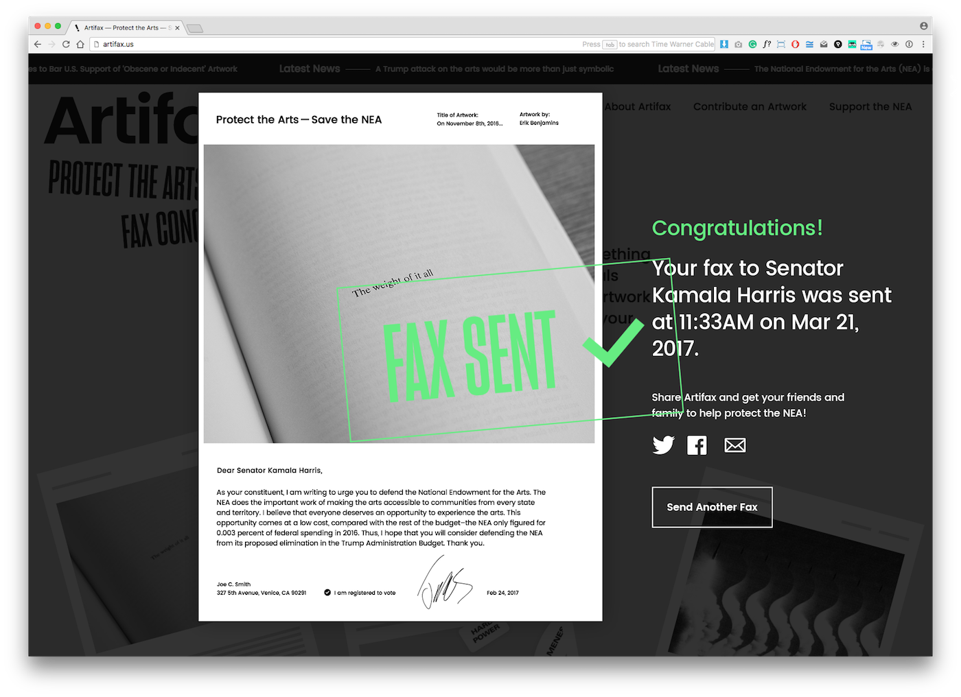 The process may sound archaic in 2017, but as Kathryn Schulz recently wrote for The New Yorker, faxes do reach congressional representatives. They get entered into a “constituent-management system” like any other message, and staffers will read each one. And as Schulz reported, personalized forms of material communication actually have more sway on a lawmaker’s opinion than a phone call. Faxing a message may take much more time — but that’s why services like Artifax are particularly handy for amplifying your concerns while adding a little creative flair to your political activism.