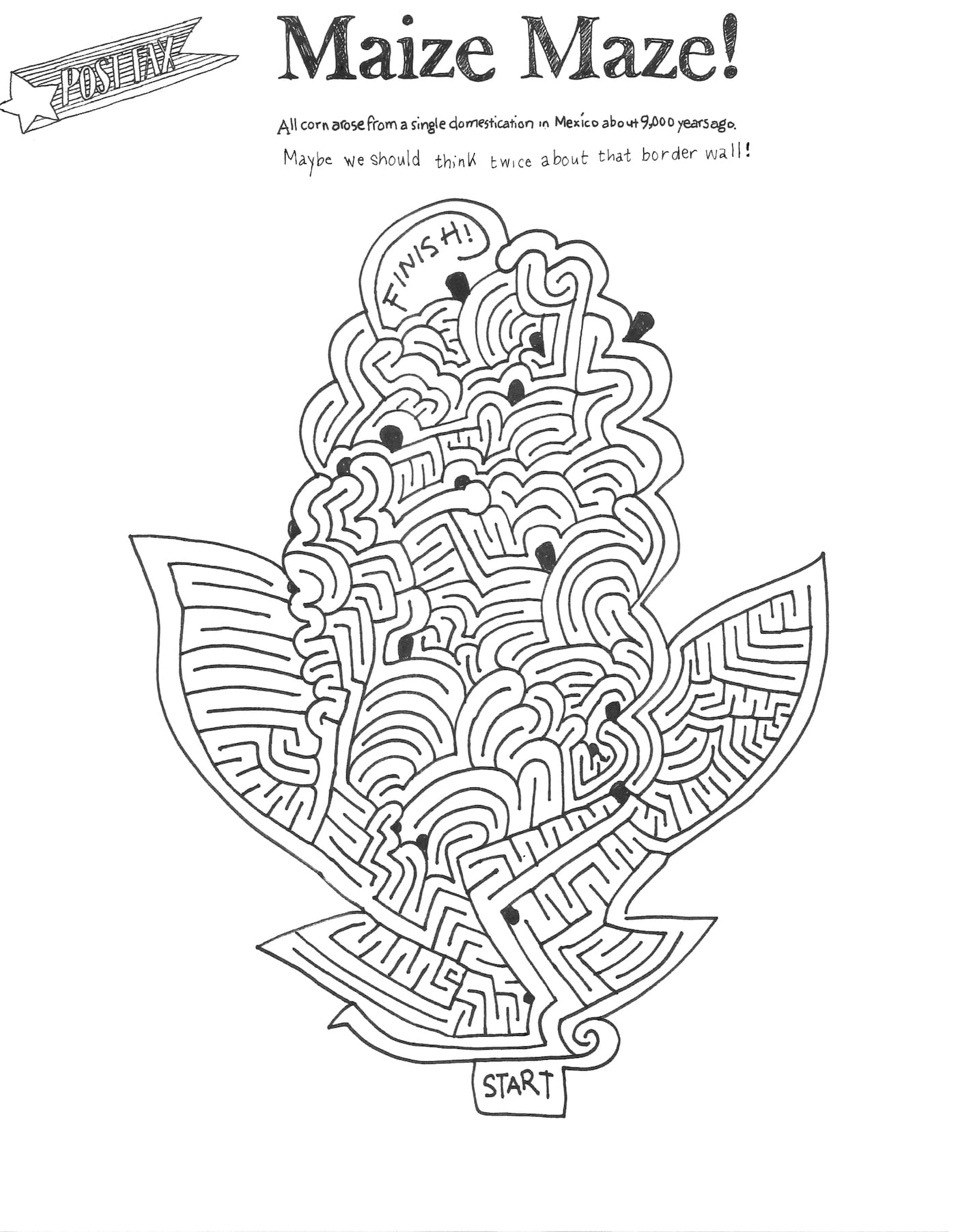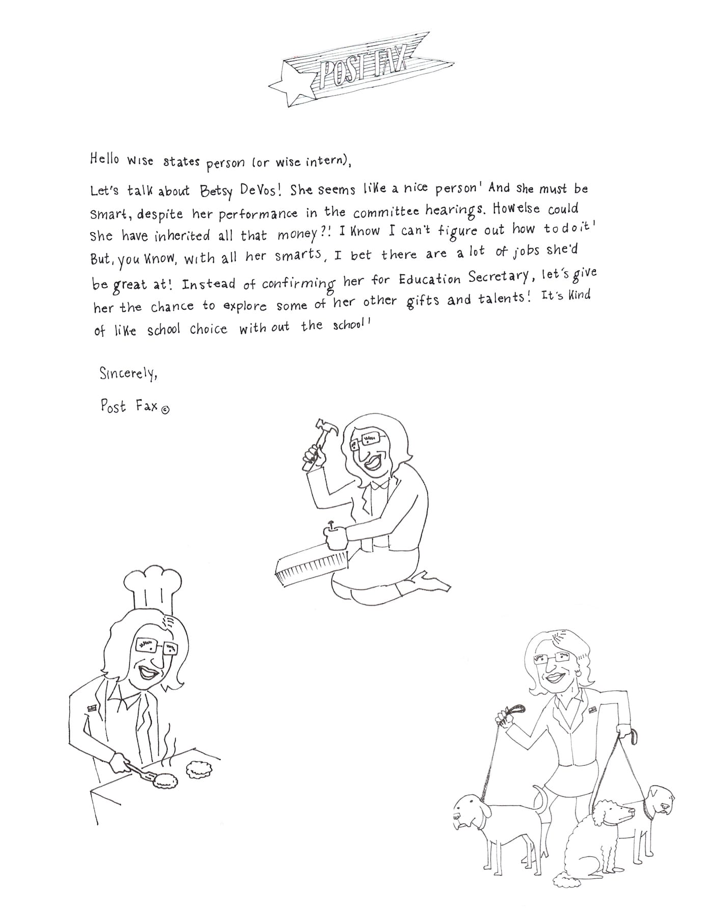 Another faxing campaign that emerged after the presidential election is Post Fax, which sends delightfully hand-drawn faxes to staffers and interns at congressional offices, particularly those in swing districts. Created by two artists who to remain anonymous, the project aims to “counteract the toxic political culture infecting the hearts and minds of our countrymen,” as the pair said in a statement. Their documents feature comical illustrations to highlight concerns, such as Betsy DeVos’s role as Education Secretary, and pointed activities to approach issues from a fresh perspective, like a labyrinthine maze intended to make a recipient consider the consequences of building a border wall.