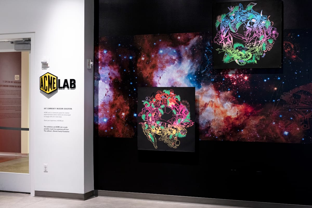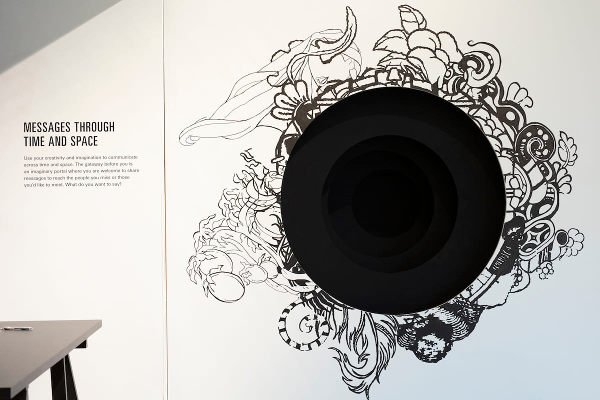 Initiating connection is an integral part of the exhibition. In spirit with the collaborative qualities of the museum’s Acme Lab, the exhibition also features an interactive display enabling access to electronic portals, as well as a wall painted with one of Ferreira’s portals surrounding a large circular cutout. Inside, black wooden circles create a cavern for an interactive process that invites viewers to inscribe messages — using materials from a nearby table — to those they’ve lost. The act of ruminating on such a message before releasing it into the portal is surprisingly emotional, a process of silent meditation and personal recognition of one’s grief that is rare in today’s world.