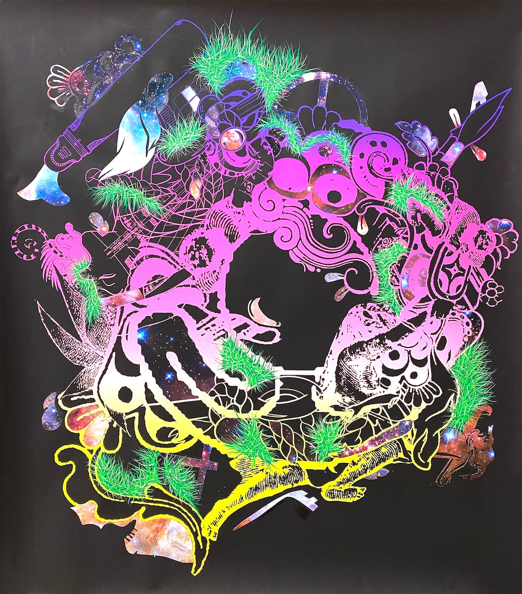 In “No darkness I can’t overcome,” (2021) sections of grass emanate around the circular portal alongside feathers, a cartoon-like animation, and the Millennium Falcon and R2D2 from Star Wars. “Every time it feels so good, it hurts sometimes,” (2021) and “Burning through my darkest night,” (2021) also depict swirling and intersecting imagery around a black hole, as if to symbolize the explosiveness of our image-driven world.