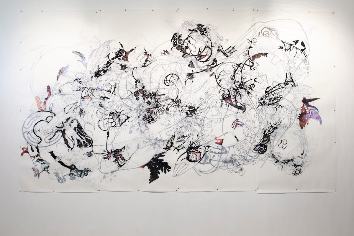 The works incorporate a central portal, circular configurations that each combine novel and delicately intricate illustrative elements such as plants, swirling waves, and machine-like appendages. The artist envisions these circles — a symbolic shape in many cultural traditions — as gateways that allow viewers to communicate with lost loved ones or persons from times past.