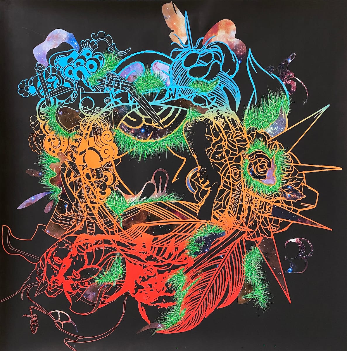 Ferreira is a multidisciplinary artist, curator, and museum educator whose energetically layered collages and illustrations invite careful attention. His work visualizes a confluence of influences ranging from popular culture to psychedelic patterns and historical imagery. Denae Shanidiin (Diné Navajo Nation and Korean) is an artist and community activist, whose practice sheds light on the social and political issues impacting Native peoples. In addition to her artistic practice, she serves as a consultant for Restoring Ancestral Winds, a nonprofit aimed at addressing issues of violence in Indigenous communities through outreach and education.