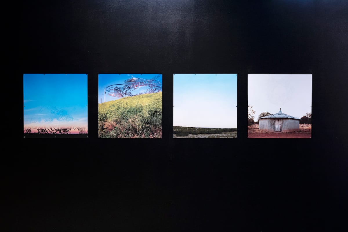 Along the gallery’s east wall, a series of photographs capture the sky, a lush green hill, sand, and a circular structure situated on red earth. Accompanying the images are titles and passages taken from Navajo language and teachings, authored by Shanadiin in 2021. The image titles and passage correspond are directional — “E’e’aah, West,” “Náhookǫs, North,” “Ha’aa’aah, East,” and “Shádi'ááh, South,” respectively.