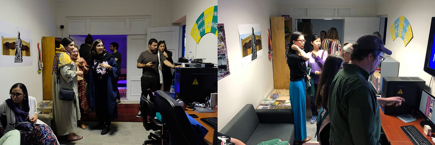Visitors at the event room (left, Tehran, right, Pittsburgh) watch “Three Rather Than Two (or One),” a video by artist Arash Fayez (Iran, 2019), part of the Voice-over (in Three Parts) curated by Joseph Del Pesco and Sohrab Kashani, September-November 2019, Tehran, Iran and Pittsburgh, PA (photos by Siavash Naghshbandi, Tehran) / Tom Little, Pittsburgh)
