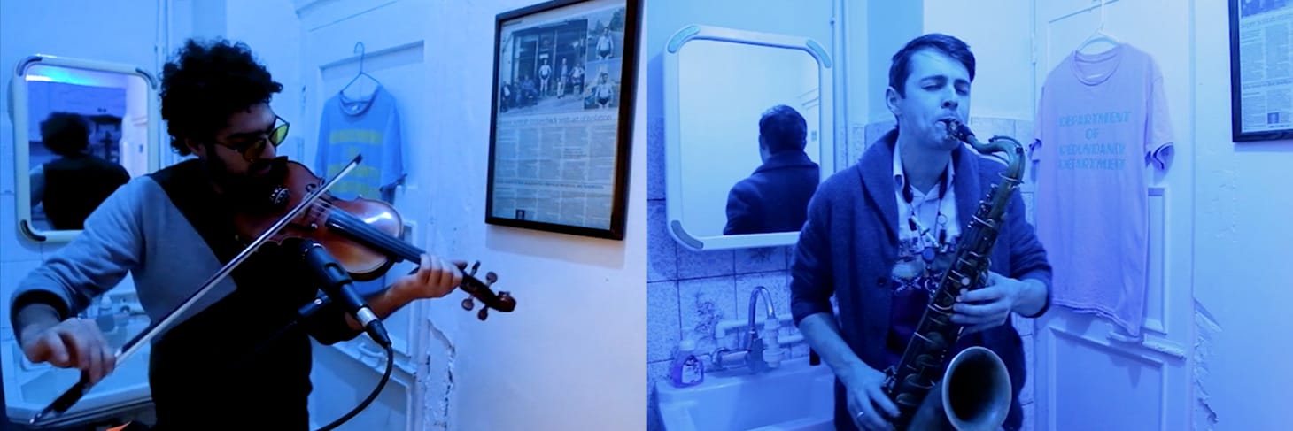 Musicians Niki Yaghmaee (left, Tehran) and Patrick Breiner (right, Pittsburgh) cover songs by the Mexican band, Para Decir Adios at “The Other Apartment’s” bathroom hallway; Jon Rubin and Sohrab Kashani, The Silence, January 2020, Tehran, Iran and Pittsburgh PA (photos by Siavash Naghshbandi, Tehran, and David Bernabo, Pittsburgh)