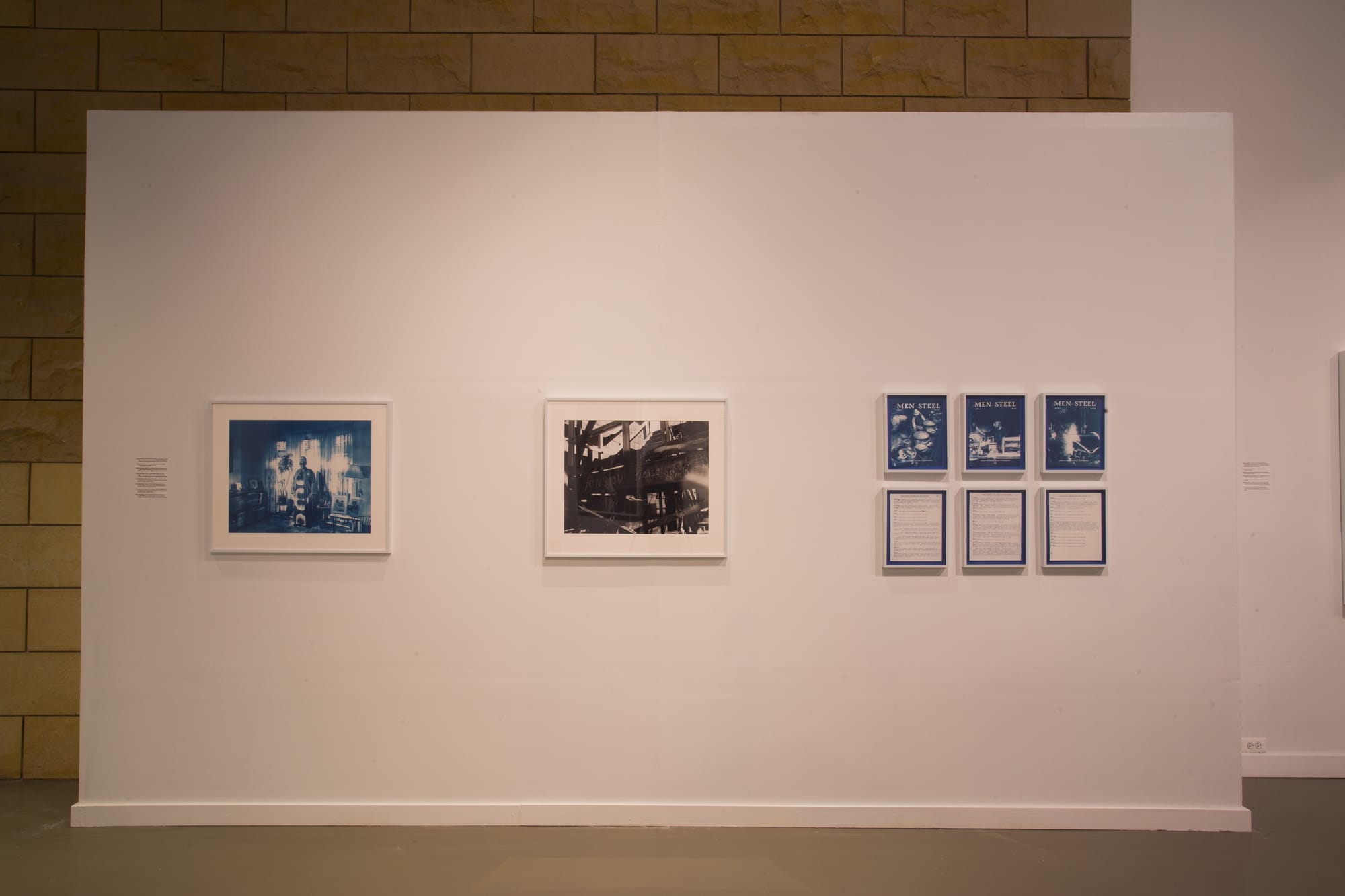 This paradox parallels Frazier’s representation of the contradictions inherent in the steel industry’s influence on Pittsburgh. For On the Making of Steel Genesis, her focus on the negative impacts of the industry’s decline in the area highlights how, in many cases, the city’s shift towards white-collar labor has literally and figuratively written its blue-collar history out of the landscape, as malls and football fields physically replace old steel mills and the city’s marketing campaigns have attempted to attract more technology jobs into the area. Her work also calls attention to the detrimental effects of the steel mills on working-class communities, especially with regard to people of color. Many of her photographs are cyanotypes of archival records related to J&L, from Ford’s personal collection, including statistics about fatal accidents dating back to the early 20th century, insurance claim settlements, and workplace safety concerns. Her works emphasize the physical perils of this line of blue-collar labor through the blue hue of the printed image.