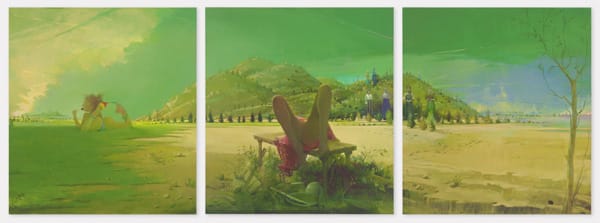 In Triptych, which spans nearly twenty feet, a naked farm girl is spread out on a coarse wooden table like a turkey dinner. Legs splayed, a daub of paint on the Mons pubis reveals her crotch, which is freshly shaved. Panties are nowhere to be found. As the girl spills off the table, we catch a glimpse of a pale breast and erect pink nipple, chewy as a gumdrop. Like Gustave Courbet’s crotch-focused painting “The Origin of the World” (1866), the girl’s face is never revealed.