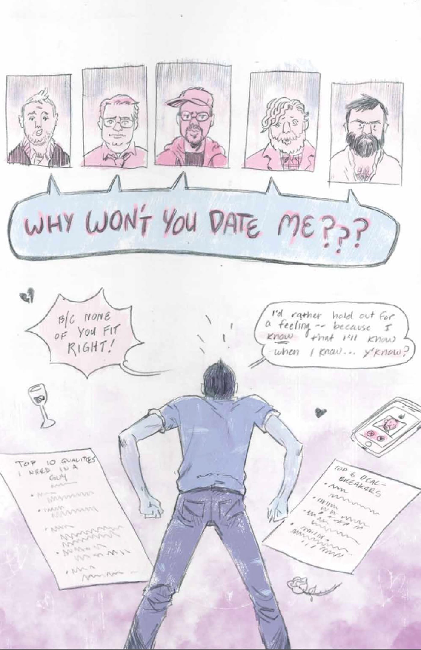 Shortly after the birth of her daughter, Roberts enrolls in a daytime wellness hospital. One panel shows a close-up of the clipboard on which she completes her entry survey. Under “State your goals,” she has written, “I want to get rid of the extremes and live in the middle. I want to be in control.” Roberts suffers from bipolar disorder, causing her to have intense highs and lows. For Grace, it’s extreme depression. “It’s almost immediate how quickly the numbness sets in,” he explains while depicting an empty silhouette of himself. “I learned to stop chasing intense experiences because even those began to feel hollow.” The majority of Nothing Lasts Forever details Grace’s online dating, failed relationships, and struggles with a stomach illness. One spread shows him looking up at a row of men’s headshots, like those on a dating app, all calling out “WHY WON’T YOU DATE ME???” Floating below and surrounding Grace are papers with lists of a partner’s ideal qualities, and he replies, “B/C NONE OF YOU FIT RIGHT!” In the background of these trials looms Grace’s depression, causing him to pull away from serious romantic commitment, though he craves it. Even his artistic success seems to fuel his deep well of sadness. “Why am I surrounded by love & support and still think about dying?” he wonders in an old drawing. He revisits that drawing years later and worries that the sadness has returned. “ACCLAIM DOESN’T FIX DEPRESSION” states a banner across a spread showing him writing, drawing, and smiling.