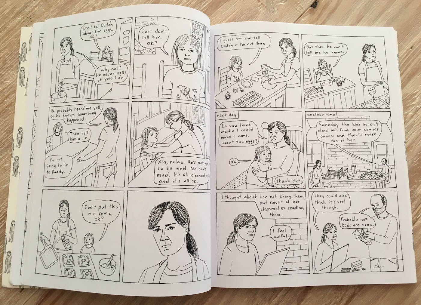 For both artists, mental struggles complicate their semiautobiographical work. Roberts considers its impact on her daughter Xia’s life, both medically and socially. “I used to look at Xia and wonder what she might have inherited from me,” Roberts writes over a panel showing her baby happily snuggled in a carrier. Later, Xia tells her mother that her cousin read her parts of her comic. Roberts thinks, “It would feel terrible if some kid told you something about your own family that you hadn’t known.” The fear floats above a bubble in which she imagines how this would go: “Your mom’s bipolar,” a young girl says to Xia. “What’s that?” she asks. “I don’t know, but it’s really bad.” The final panel on the page shows Roberts telling Xia herself, to avoid this imagined scenario. Talking about her depression with her daughter is hard, and is only made more difficult by her status as a creative professional.