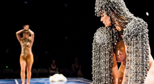 For me, beginning of something evoked a handful of things, most particularly the fashion world: with the raised stage, audience sitting all around, women’s bodies moving through space in various states of undress, and their faces wearing protective expressions in front of a glaring audience, the parallels with runway shows were unmistakable. At times, the piece evoked drag performance as well, in the sense that there was an acknowledged mis-fit as each performer donned a new outfit or removed one — a putting on of a persona or a suit of armor, whether it be the clothing or one’s own skin. And of course, too, there were clear themes around female identity, female bodies, looking inward, and the gaze of others.