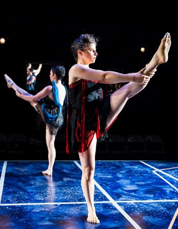 This year the dance is back, looking a bit more polished, at the New York Live Arts space in Chelsea (formerly Dance Theater Workshop). The performance area and audience are both located on the theater’s deep and wide stage, with a large glittering curtain enclosing the space so that the traditional seating area can’t be seen. As in the previous performance, the stage that the performers dance on is a raised and painted platform about a foot and a half off the ground, with half the audience sitting on cushions on the floor and the other half sitting in folding chairs behind them. A small, separate stage is visible in the wings on one side, housing the musicians who provide live accompaniment for parts of the show.