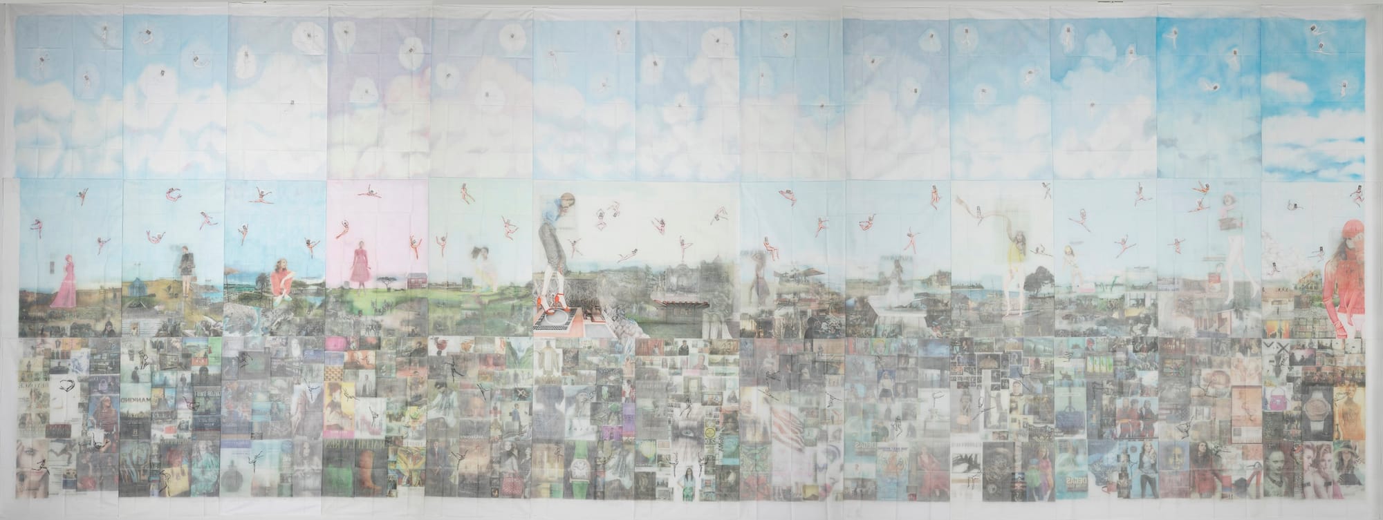 Krimes, who served his first year in solitary confinement — considered a form of psychological torture by human rights groups — has spoken openly about his relative fortune compared to Black and Brown individuals he met in prison who faced harsher sentences for similar charges. His massive mural "Apokaluptein:16389067" (2010–13), printed onto cotton bed sheets that he mailed out one by one and later stitched together, collages advertisements, drawings, and news images of contemporary crises both natural and man-made into a Dantean topography of the criminal justice system.