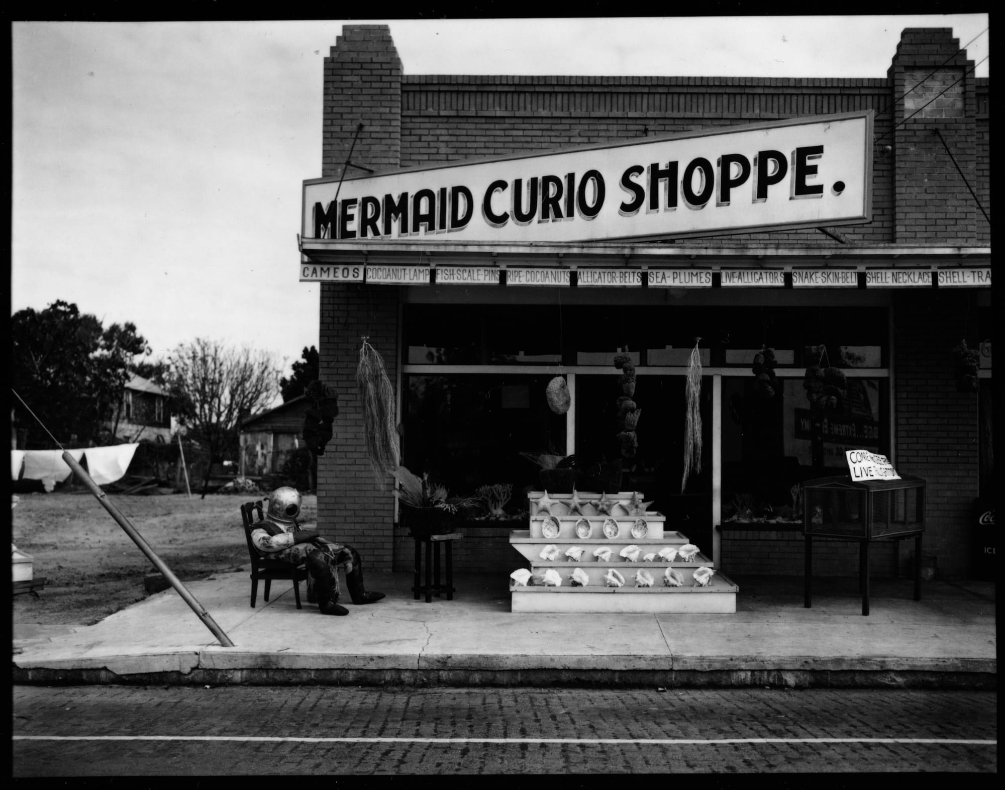 The unmistakable discomfort of dissonance runs through Samoylova’s series Floridas, which dates from 2017, when Trump took office, to 2021, the year of the January 6 insurrection. The artist road-tripped from her Miami home to parts of the state that epitomize the phrase “the more north you go, the more south you get” in order to photograph a roadside gun store in Port Orange in 2019. The vibrantly painted exterior of J and L Guns is adorned with chilling silhouettes of AK-47-style assault rifles; this summer, the business shared its “emphatic” endorsement of Trump on its Facebook page. Elsewhere in the exhibition, Evans’s picture of a "Mermaid Curio" shop, an undeveloped film negative from one of the documentary photographer’s various trips to Florida, is like an uncanny mirror image.
