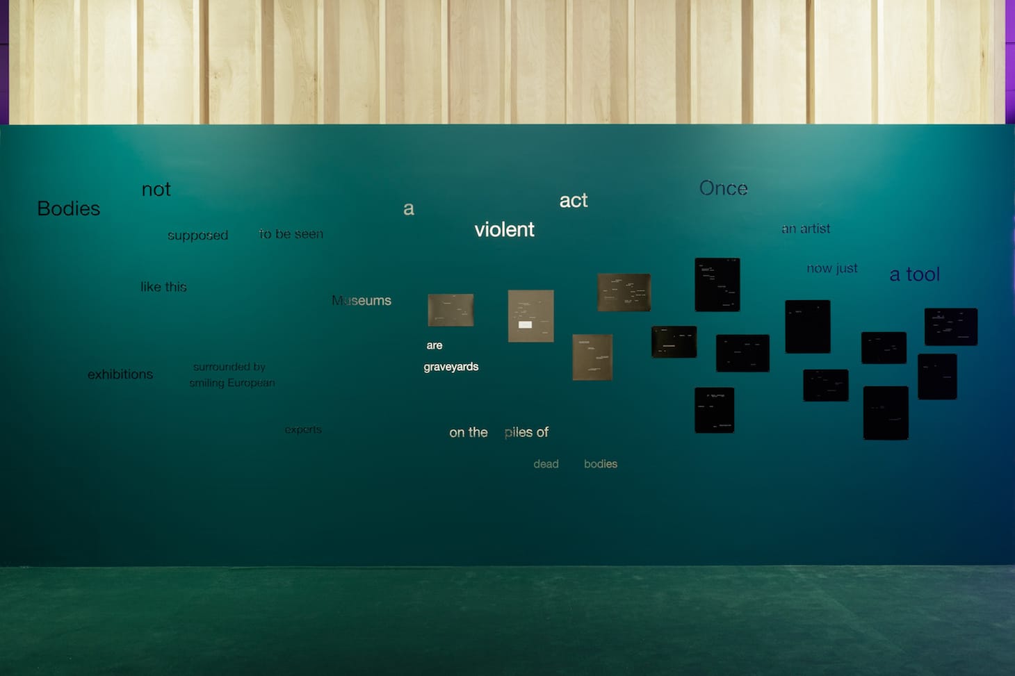 Leading to the main exhibition space are two installations that serve as a threshold between the inside and outside experiences of occupation. Don’t read poetics in these lines (2010-21) is a series of prints based on Twitter exchanges. The work offers a sense of the the reactive quality of social media traffic surrounding the Arab revolutions, characterized by an oversimplified and spurious conversation that still governs the construction of widespread media narratives. Interwoven with this work, Once an artist, now just a tool (2021) is composed of text in vinyl lettering scattered across the wall. “The artists prompt the institution into conversation, by exposing the colonial violence and wrongful appropriation involved in museum practices,” the curator has explained. Both of these projects attest to the role of mediation in creating, erasing, or transforming the narratives that shape public opinion and how we act upon it.