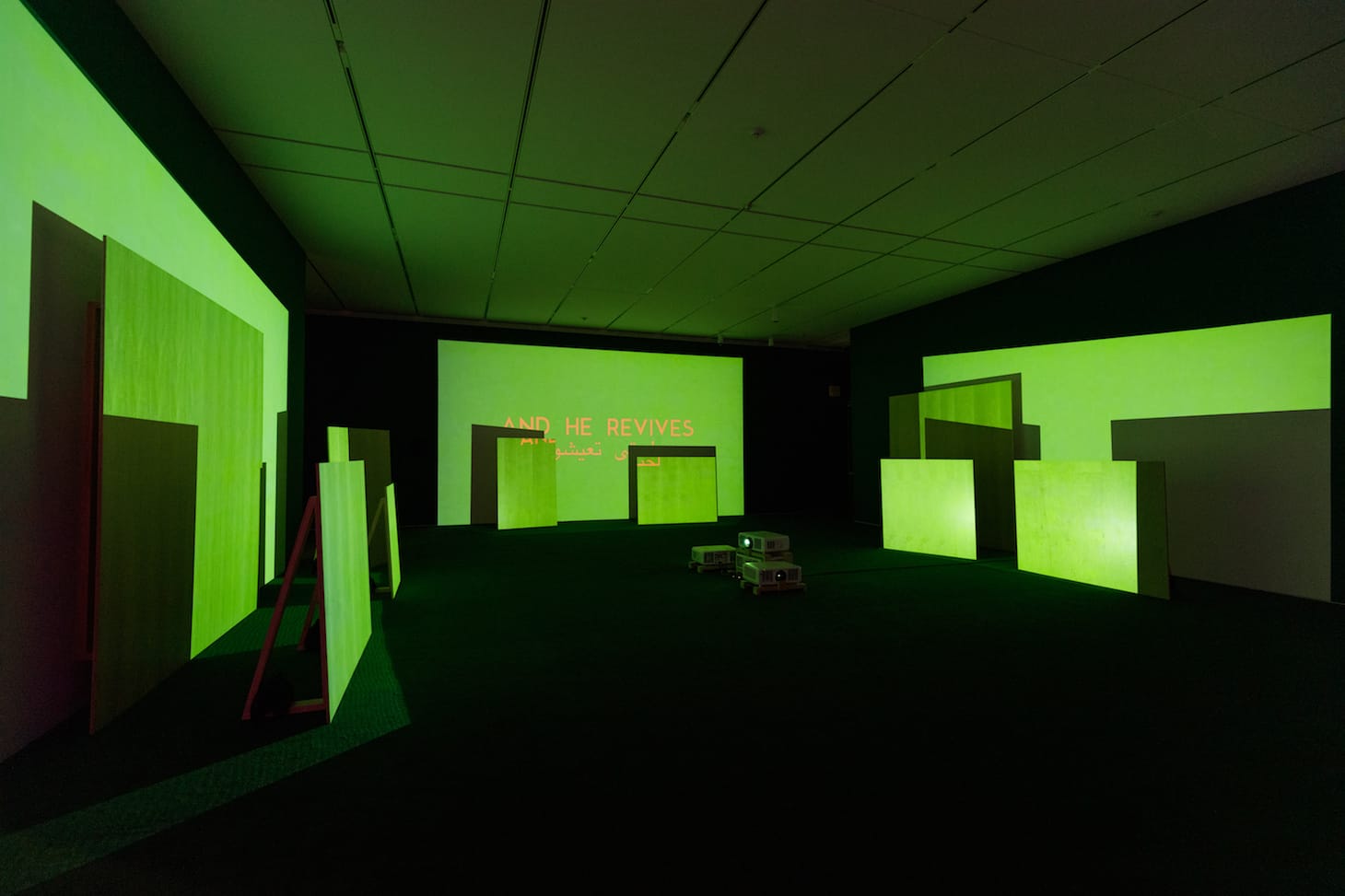 Oh shining star testify follows the same format, projecting layered images onto panels and immersing visitors in atmospheric sound. The work is organized around CCTV footage of the killing of 14-year-old Yusuf Shawamreh by Israeli military forces on March 19, 2014, for crossing the annexation wall that cuts through his village to pick edible plants. This video is interspersed with images of Palestinians protesting the occupation, along with occasional appearances of excerpted phrases from popular songs — which have become part of many rituals of soft resistance that take place in the daily life of Palestine. As these different elements flicker on the screen, they bring to mind the cyclical processes of cultural and even physical erasure to which Palestinians are subject constantly, and which have transformed their lives into a daily exercise of survival.