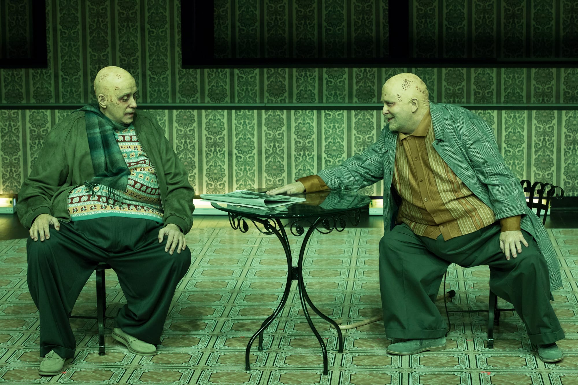 Kaye Voyce, credited with both the scenic and costume design, stuck to the bare essentials of a table reading in Mud (a table, a few chairs, and the props gathered at the foot of the narrator and unused for the most part) and conjured the setting of Drowning with a pair of garden chairs and table in fanciful wrought iron. Her costumes for Mud were unexceptional, perhaps overdone in the case of Henry whose spiffy jacket and tie seemed to go too far in differentiating him, since he appears to be more or less as broke as Lloyd and Mae. For Drowning, Voyce let herself go: the fat suits beneath boldly patterned sweaters and jackets and ballooning trousers make a joyful visual display of these repulsive men, particularly when they dance and gesture in unison; their garments sway pleasantly, almost hopefully.