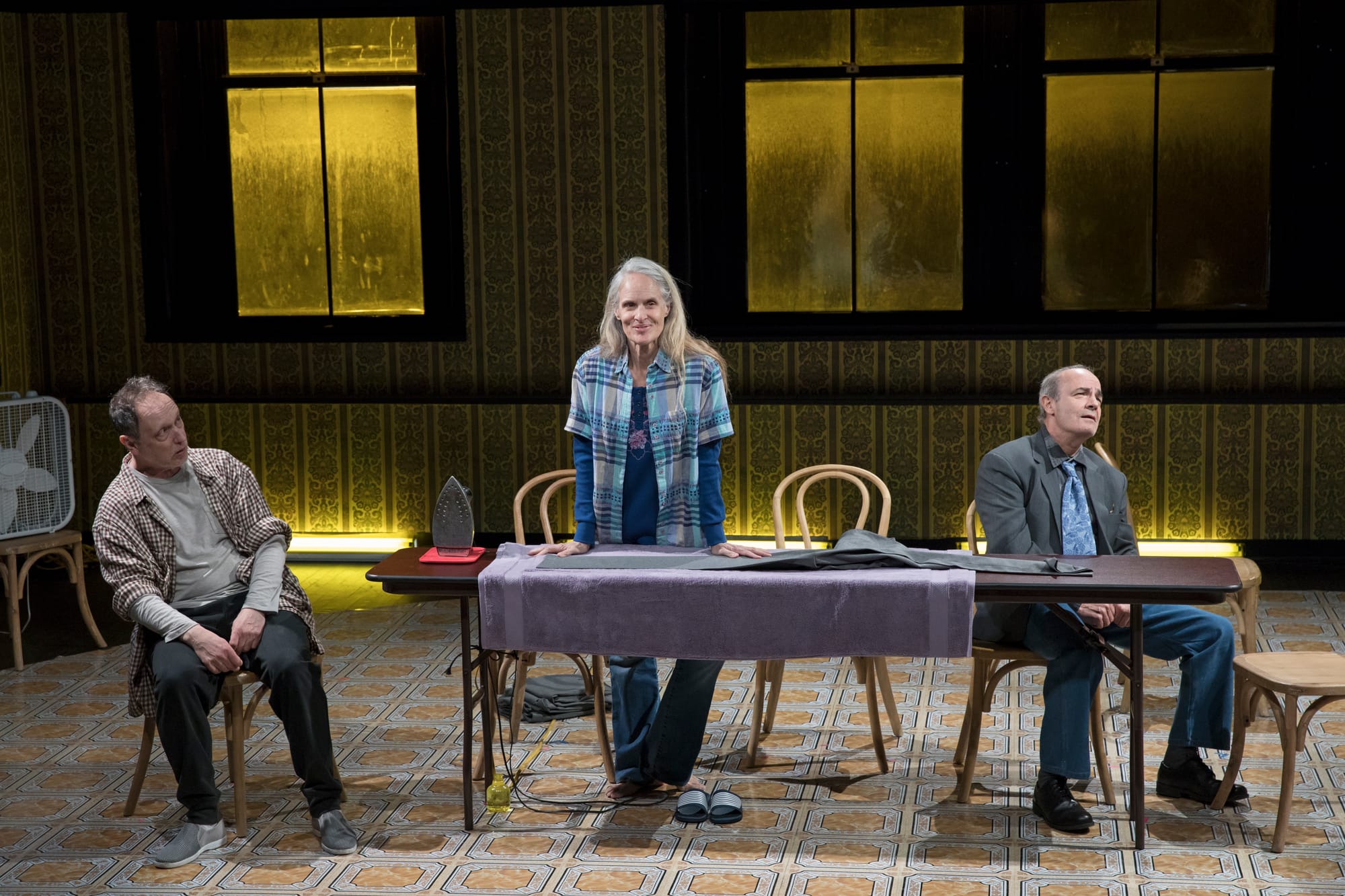 In this Mud some of the stage directions were actually performed, and some were merely read aloud. For example, throughout the play Mae irons on a laminated folding table of the sort often seen in rehearsal rooms, but some of the stage directions referring to her laundry activities are read aloud rather than acted out. The logic of these choices was unclear.