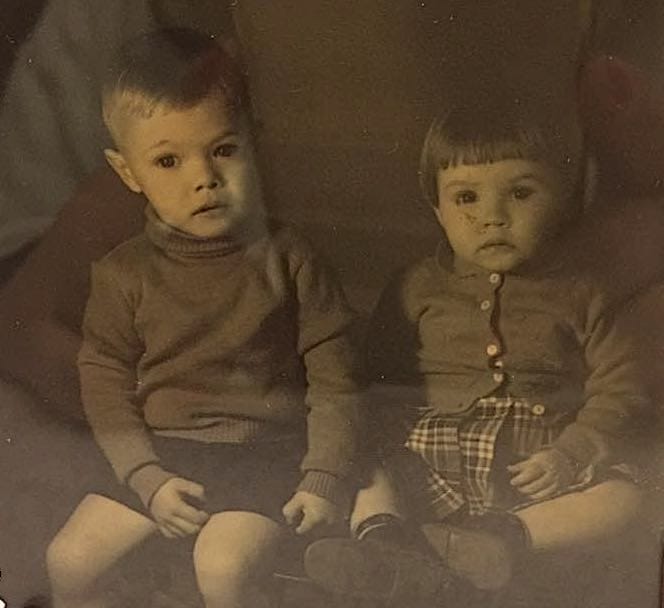 In this photo, there is a sepia layer of my mother and her brother in the 1950s, sitting close, though not holding each other. And then there is a red spot: the present tense of my mother’s nail polish, her fingers holding her phone to take a photo of the photo. Her fingers holding themselves.
