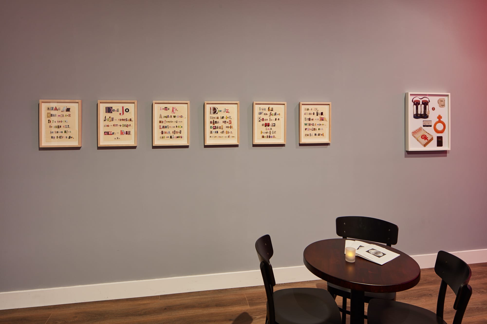 The intimate installation pairs work by multimedia artists Tammy Rae Carland and Macon Reed. Carland may be best known for tragi-comedic photographic series I’m Dying Up Here (2011), but is here represented by multiple 2-D works and a commissioned installation: Dear Jo (2010). Her evocatively collaged notes convey the author’s bittersweet ache for a paramour. No longer than one page each, the letters capture the nuance of lesbian or other forbidden love as something nurtured in secret, perhaps through furtively passed notes or in the low light of a favorite bar. “Save the last dance for me” (2019) represents Carland’s collaboration with Los Angeles-based musician Kelly Martin; the stage-like corner of the gallery-cum-bar is enlivened by the repeating track from which the installation draws its title. When not populated by performers, the unoccupied stage is all the more lonely for the soundtrack that plays in a loop, suggesting absence where once there was presence and gesturing mournfully to the loss of not only dyke bars as physical spaces, but to communities of friends and lovers that once visited. At first, I was disappointed to see that the stage was not programmed during regular hours, but the absent figures symbolize both the missing physical spaces and the women who spent time there.