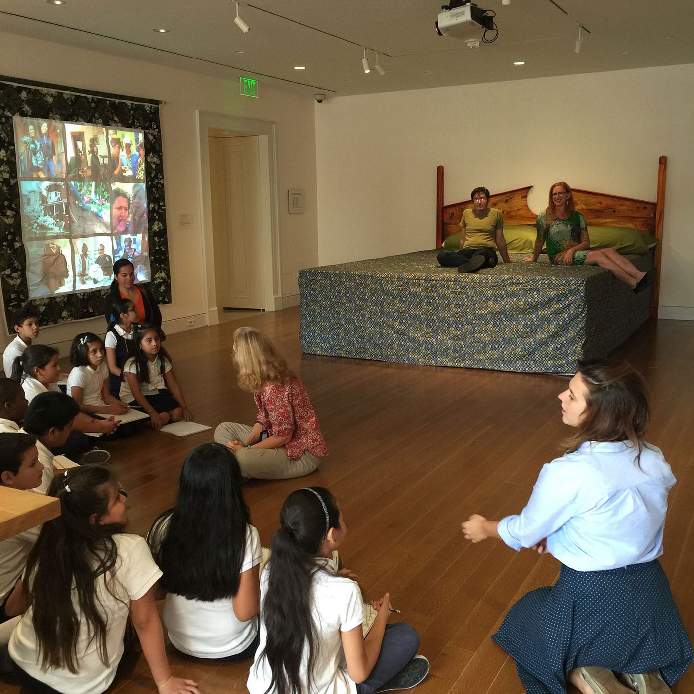 BALTIMORE — How often do you get the opportunity to loll around in bed at an art museum? Artists Rahne Alexander and Jaimes Mayhew invite the public to do just that in “Queer Interiors,” a site-specific installation within the exhibition Imagining Home at the Baltimore Museum of Art (BMA). While lying on a giant bed, complete with fluffy pillows and patterned comforter, you can watch a slide show projected onto a patchwork quilt on a far wall of snapshots from backyard barbecues, kitchens, and living rooms. If you get tired of reclining, you can also browse the books and personal ephemera displayed in several slim cabinets nearby. It isn’t overt, but the photos and objects reflect the lives of queer and transgender people, all willing participants in the project.