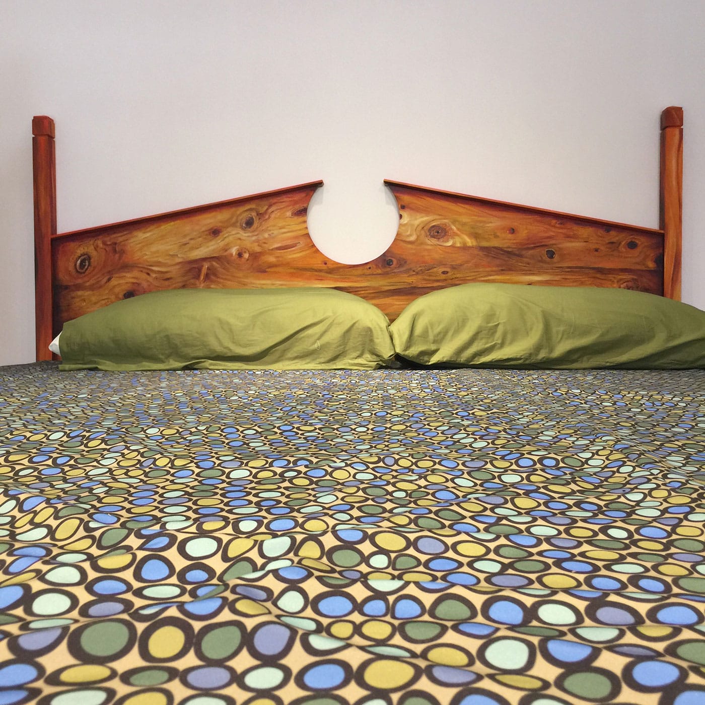 The bed was an important [image] for gay artists during the HIV/AIDS epidemic. I designed the fabric for the comforter based on the bedsheets in AA Bronson’s “Felix Partz, June 5, 1994” (1994/1999), a photograph of Bronson’s General Idea collaborator hours after his death due to AIDS-related illness. The pillows on the bed, with their indentations, refer to Felix Gonzalez-Torres’s “Untitled (billboard of an empty bed)” (1991), in which the indentations in the pillows suggest absent bodies, in particular Gonzalez-Torres’s partner Ross.