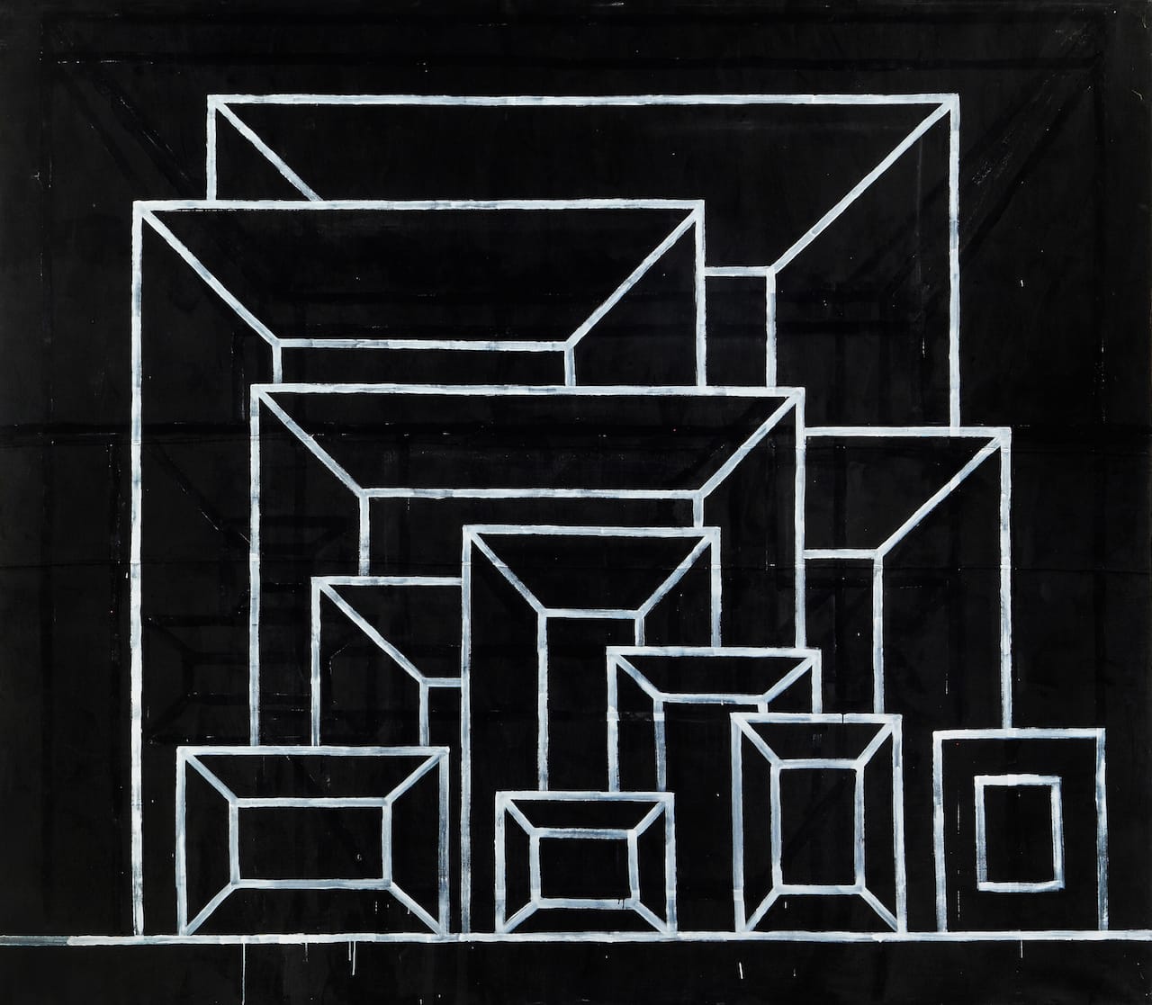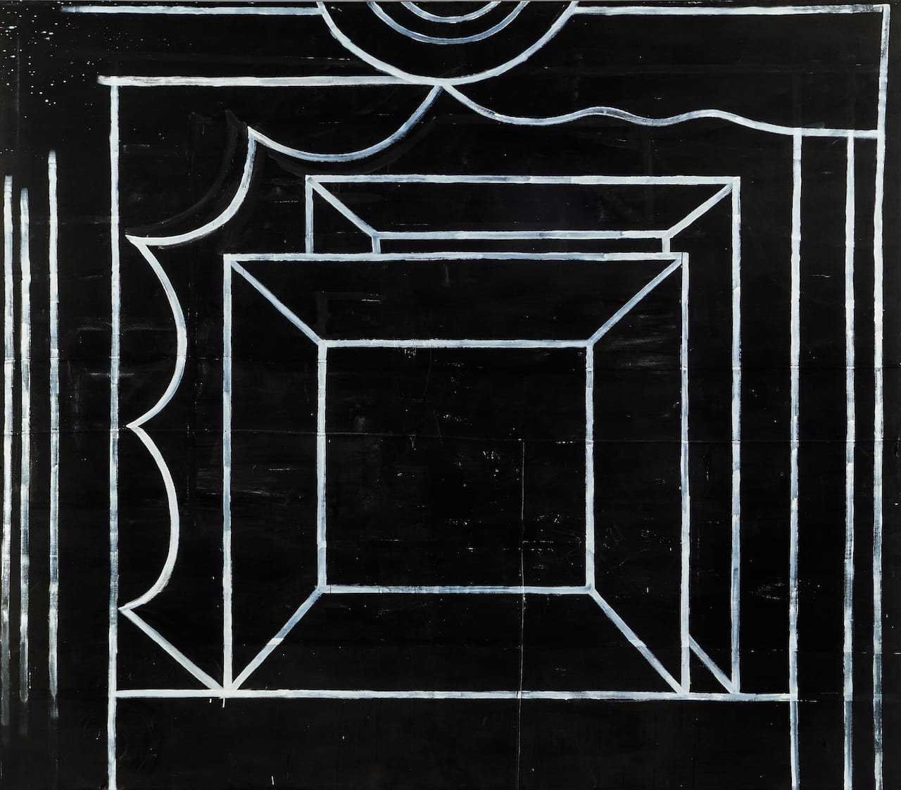 For his “black” paintings, Martin channeled the empty frame of Guston’s painting, “Frame” (1976). Instead of trying to ape or parody Guston’s luscious painterly surfaces, Martin depicted the frames graphically in white lines against a black ground. In “11” (1996), they are stacked, as if on a shelf, overlaying each other, silently waiting to be filled. Instead of suppressing his anxiety about filling a canvas, Martin faced it head on.