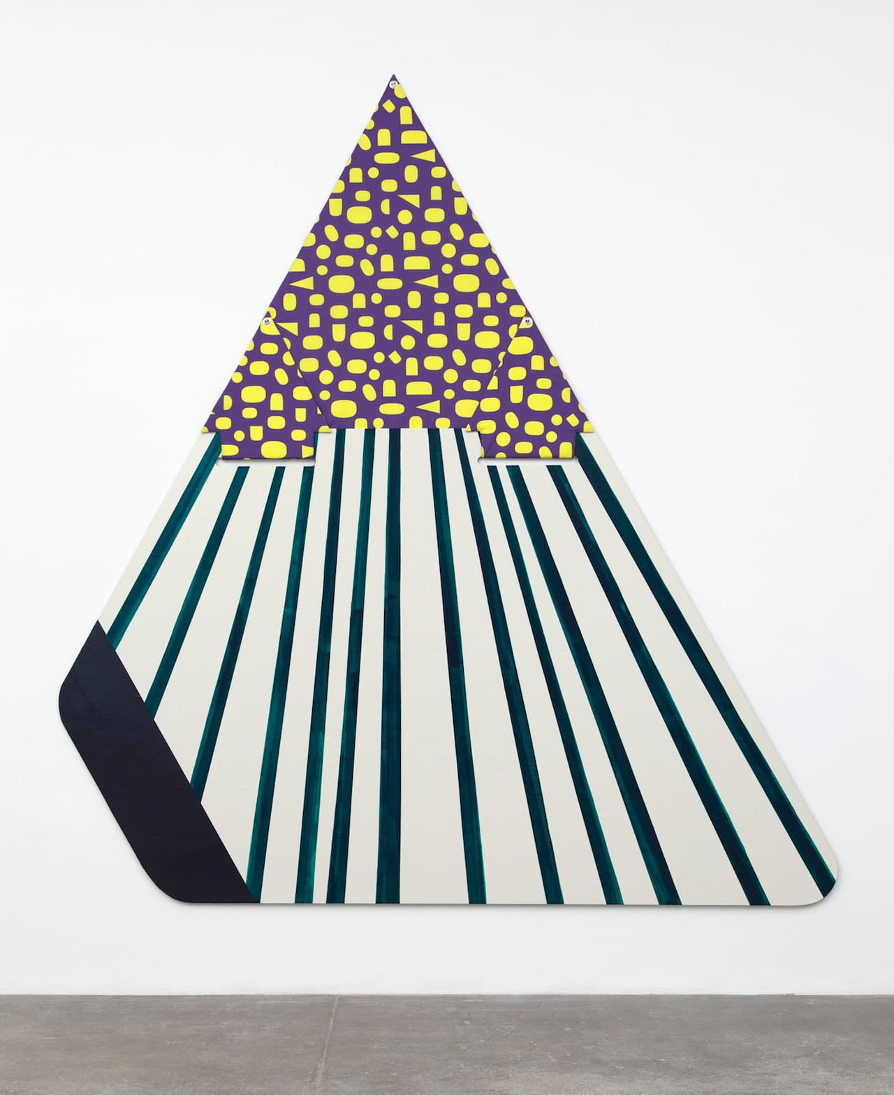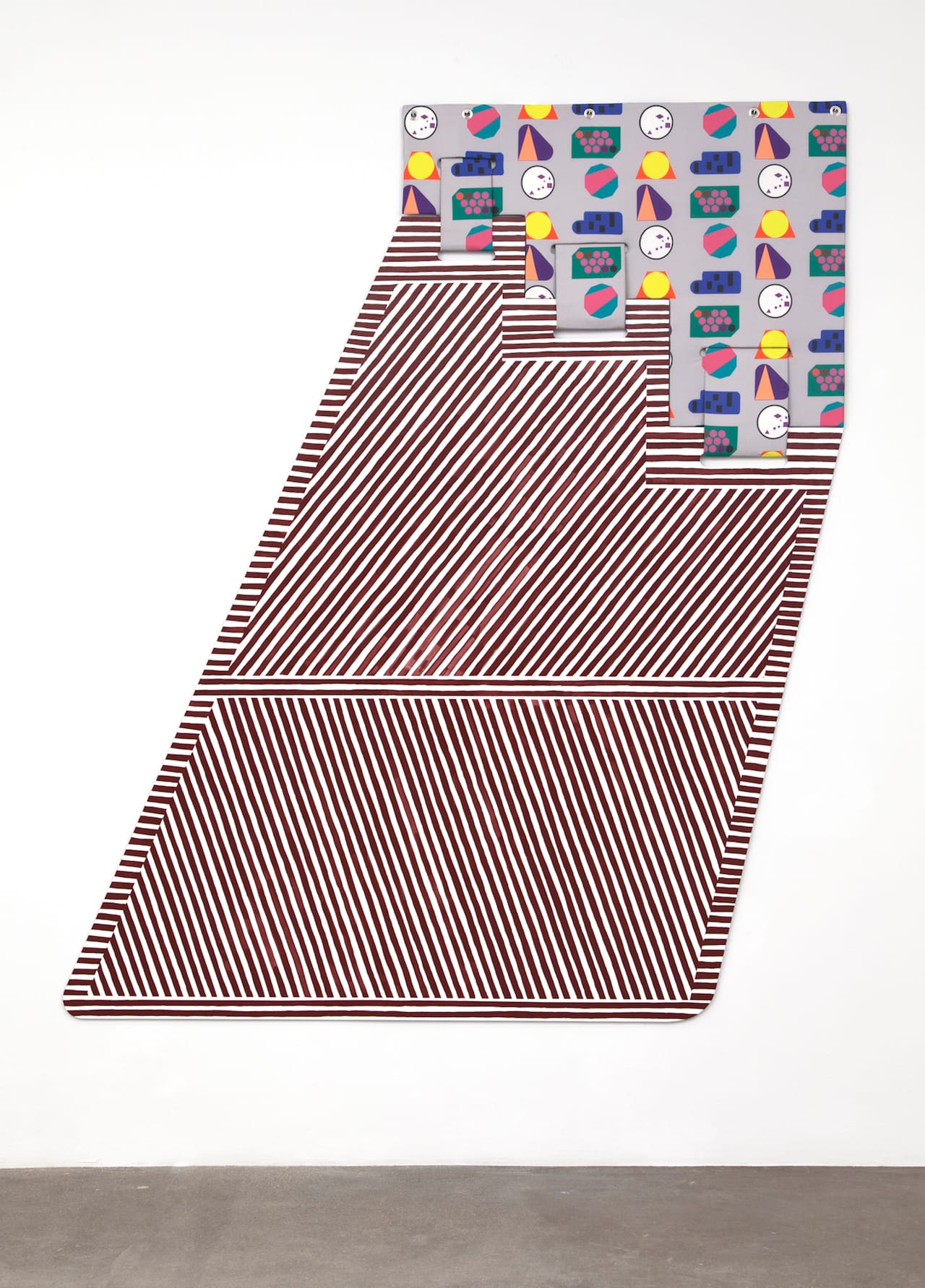 Shortly after leaving the exhibition, I found myself mesmerized by a patterned fabric bag hooked onto the back of a wheelchair. It took me a minute to realize that the pattern echoed one of the ones that I saw in Root’s exhibition. This led me to recall an association that I had while walking around the gallery: the folded fabric functioned like makeshift handles used to hoist something into the air. The nails underscored the work’s gravity, while the rising stripes and diagonal shape seemed to defy it. By making the fabric functional, Root wisely and wittily expands painting’s possibilities.